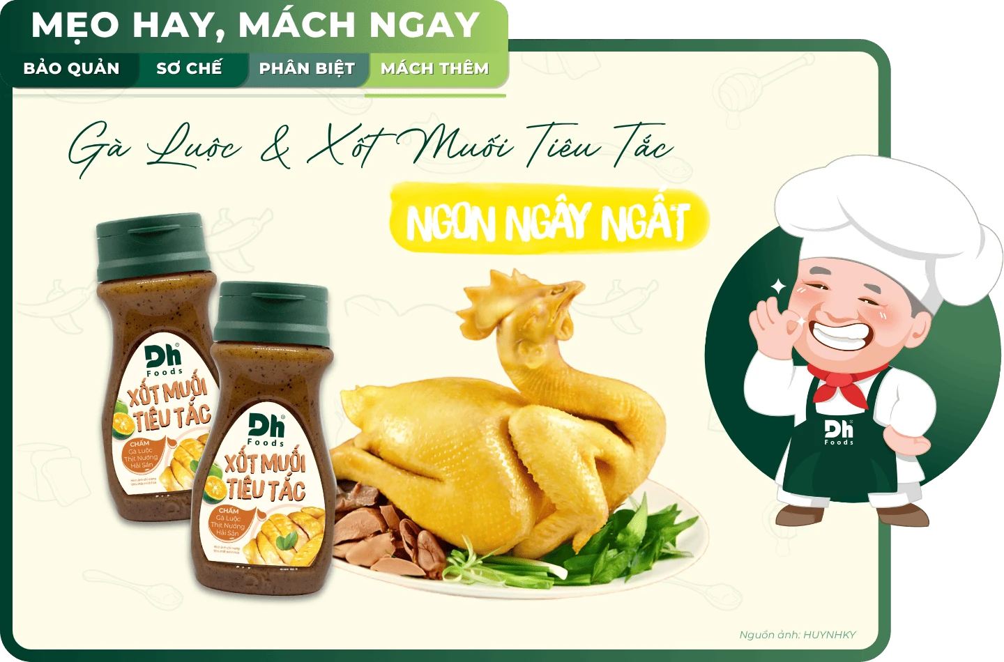 Một con gà luộc hoàn hảo không thể thiếu một chén nước chấm xứng tầm. Thay vì bỏ nhiều công sức chuẩn bị gia vị, bạn có thể thưởng thức ngay Gà luộc mọng nước cùng Xốt Muối Tiêu Tắc Dh Foods.