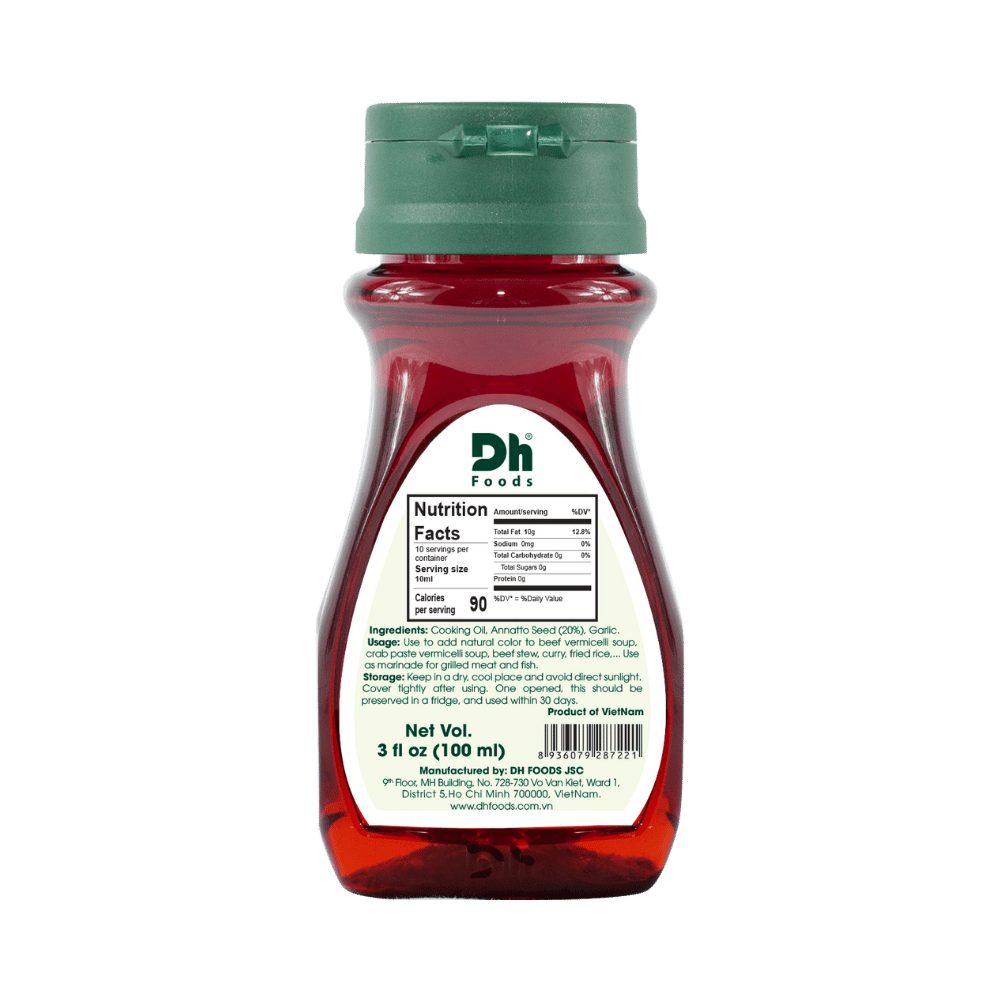 Made from the highest-quality annatto seeds, Annatto Oil adds a natural, vibrant color to dishes like braised pork, beef stew, crab noodle soup, or shredded chicken, without affecting their original taste.