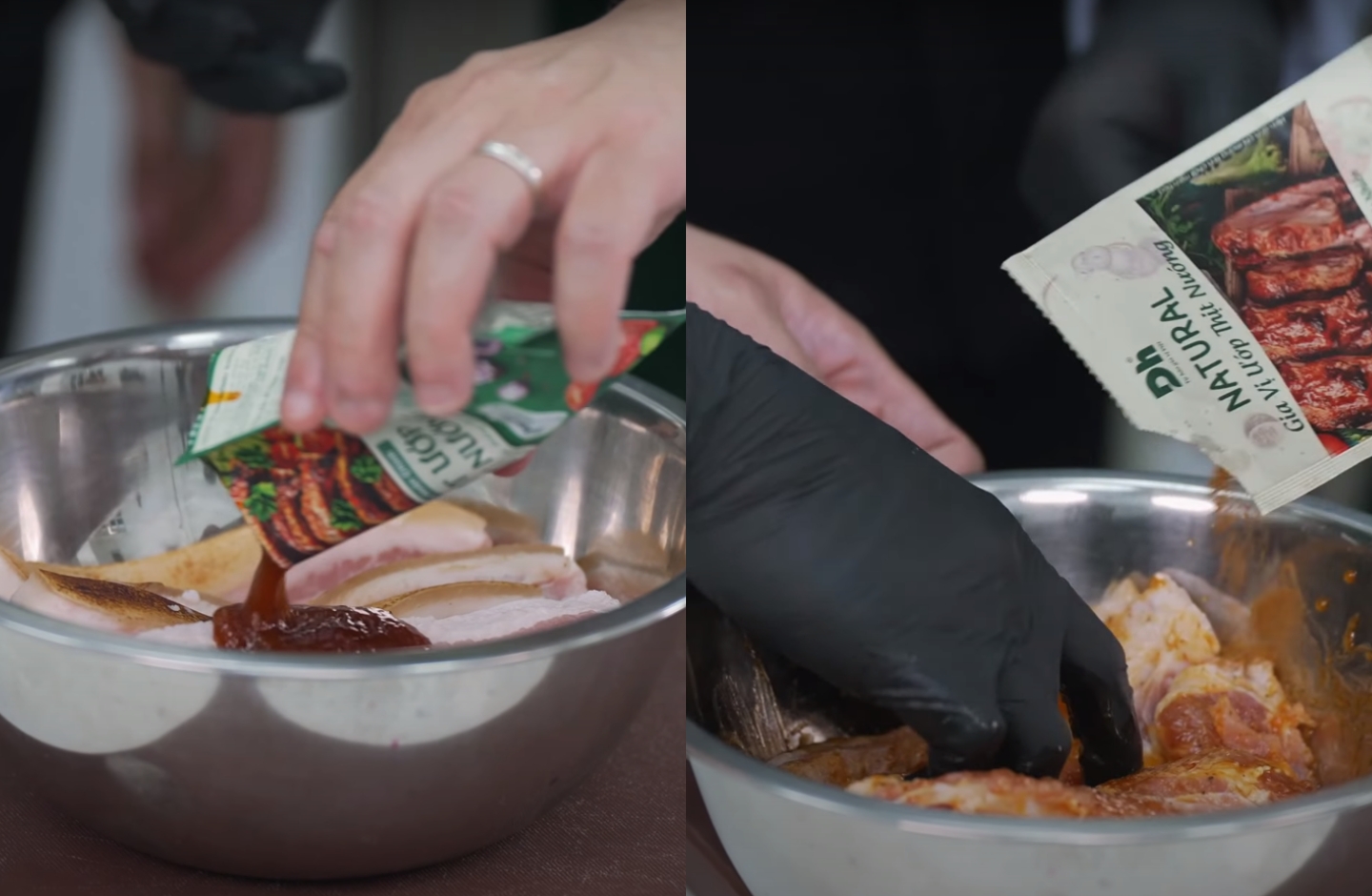 Ajoutez 1 sachet de sauce d'assaisonnement complète pour viande grillée et 3 à 5 g d'assaisonnement pour viande grillée à 500 g de porc Ban Don. Mélangez bien jusqu'à absorption complète de l'assaisonnement, puis laissez mariner la viande à température ambiante pendant 2 à 3 heures.
