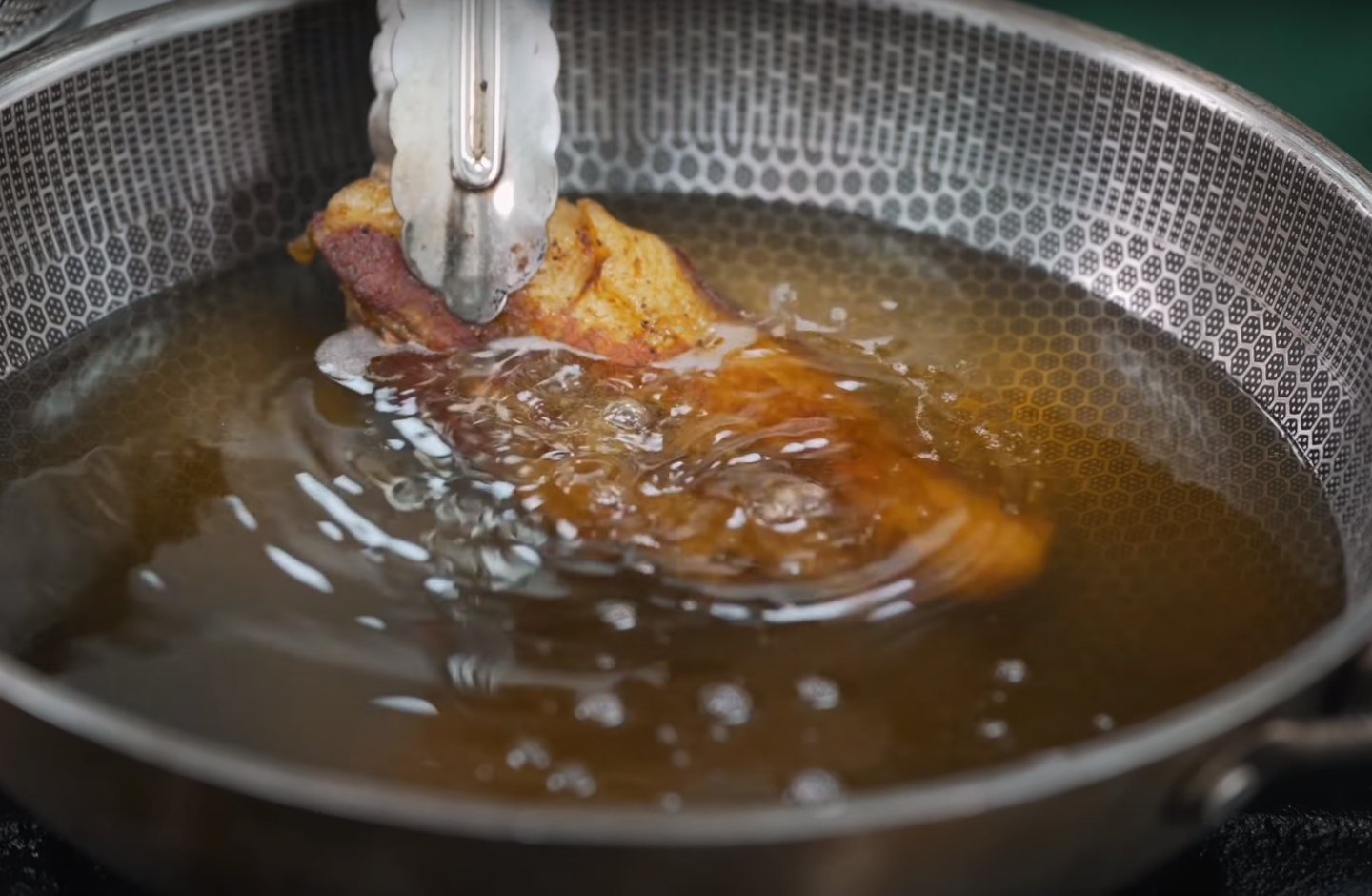 Faites frire la viande dans l’huile à 140-150 degrés Celsius pour garder la viande juteuse et la peau croustillante.