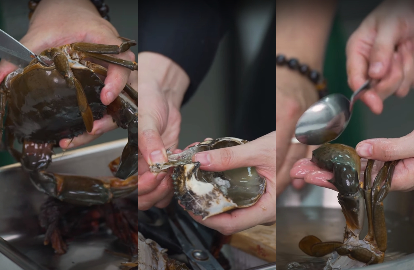 まず、カニのエプロンを剥がし、身をほぐして肺を取り除きます。カニをきれいにするために、エプロンの下にある胃袋も取り除くことをお勧めします。