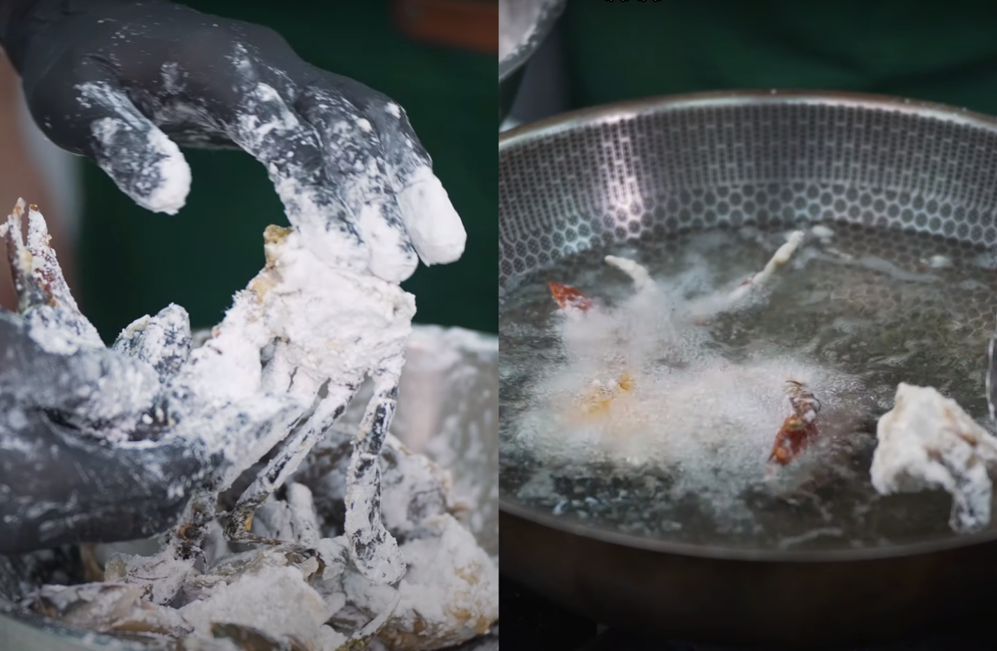 下処理が終わったら、カニに米粉またはタピオカ澱粉100gをまぶし、身が乾燥しないように強火で揚げます。カニに火が通るまで3~5分ほど揚げます。
