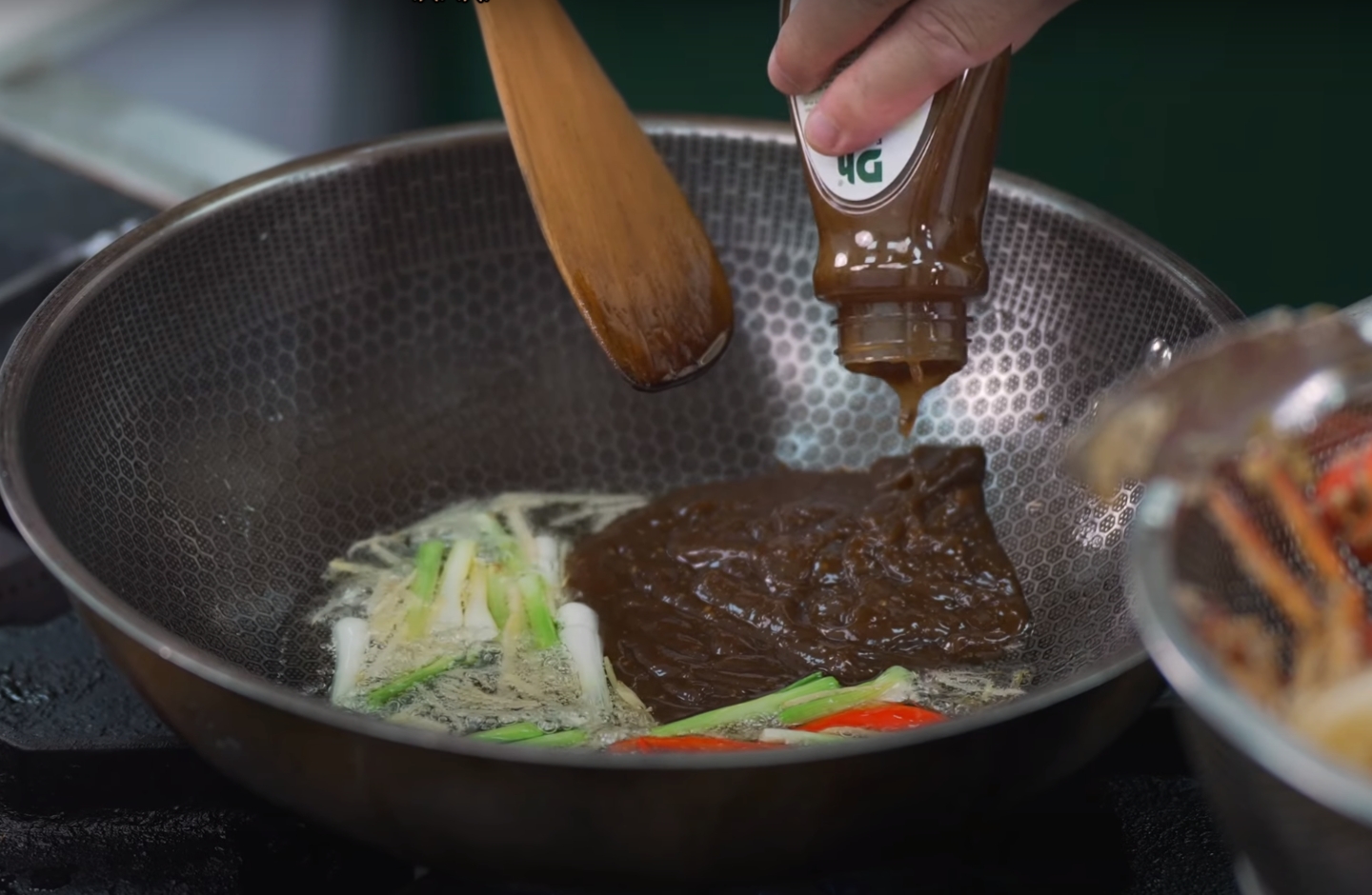 フライパンに食用油、ネギ、唐辛子3~4本、生姜50gを加え、よく混ぜます。次に、Dh Foodsのブラックペッパーソース2本を加え、さらに混ぜ続けます。ソースが沸騰し、香りが出てきたら、バター50gと揚げニンニクを加えます。最後にカニを加え、ソースが完全に染み込むまでよく混ぜます。