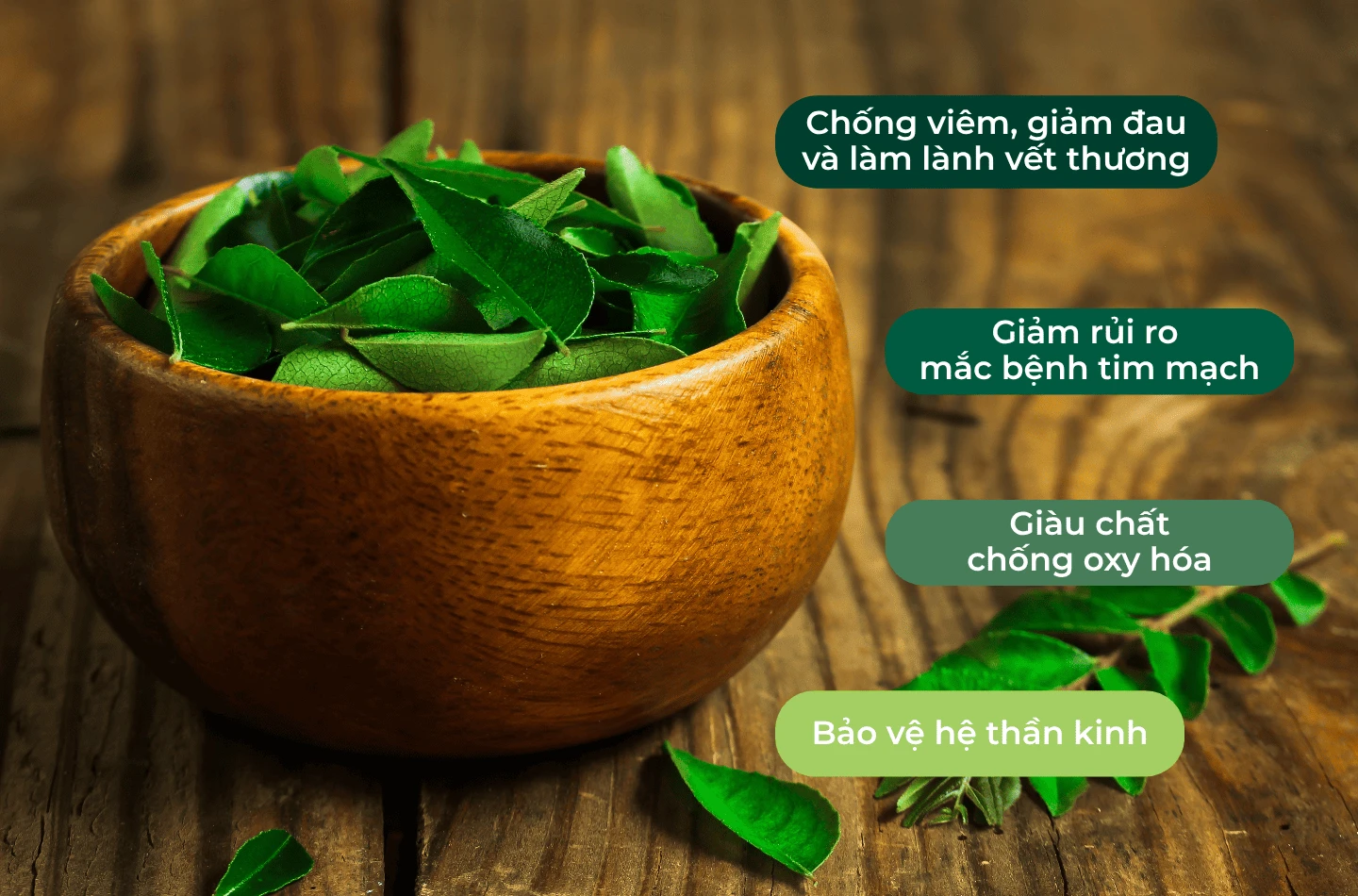 Lá cà ri chứa nhiều alkaloid, glycoside, các hợp chất phenolic, linalool và myrcene. Chúng hoạt động như những chất chống oxy hóa giúp dọn dẹp các gốc tự do, giảm căng thẳng oxy hóa và bảo vệ cơ thể khỏi nguy cơ mắc bệnh mãn tính, cũng như bảo vệ hệ thần kinh, tim, não và thận. (Theo Healthline)