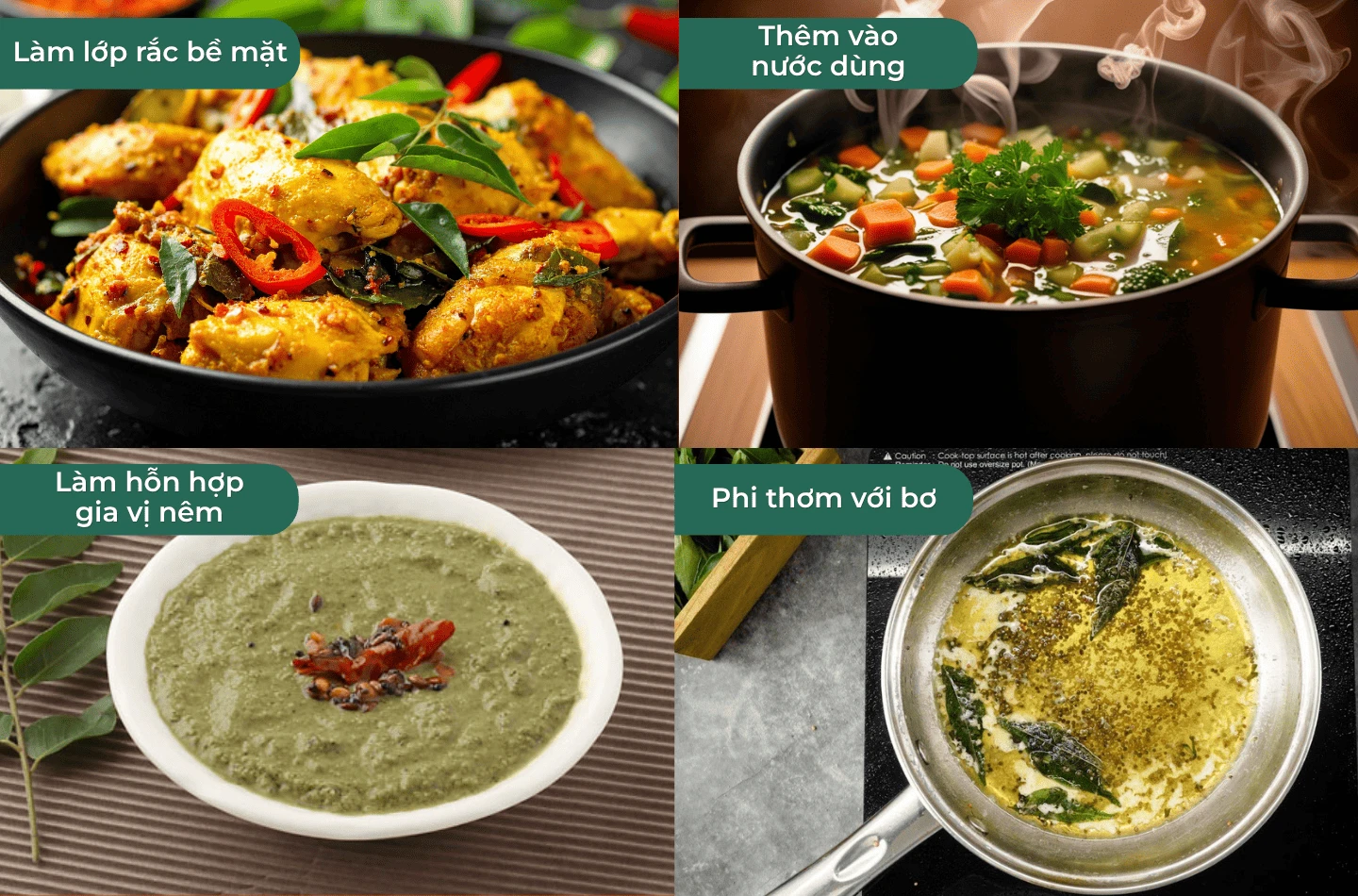 - Tạo dầu ngâm hương liệu: Nấu lá cà ri trong dầu nóng, sau đó dùng chính phần dầu đã ngấm hương vị này làm nước chấm hoặc rưới lên các loại bánh mì giòn.