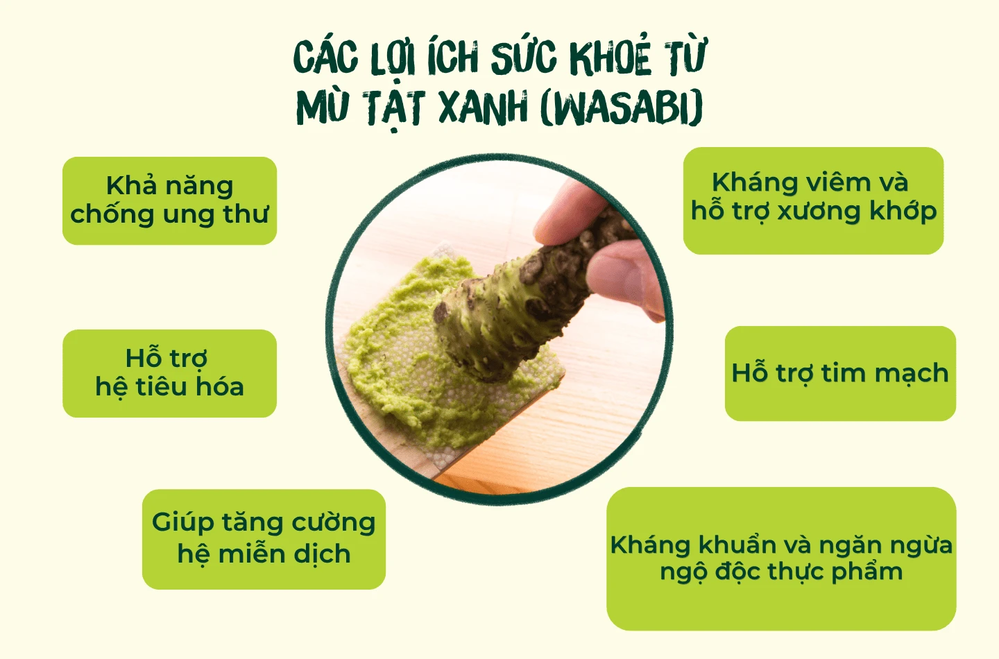 Đây là lý do vì sao Wasabi luôn đi kèm với Sushi/Sashimi. Theo trang sức khỏe hàng đầu của Mỹ - Healthline, hợp chất Allyl Isothiocyanate trong Wasabi có khả năng ức chế mạnh mẽ các loại vi khuẩn nguy hiểm như E. coli, Salmonella và Vibrio parahaemolyticus (vi khuẩn gây ngộ độc từ hải sản sống). Đặc tính kháng khuẩn tự nhiên giúp tiêu diệt các vi khuẩn có hại trong thực phẩm tươi sống, ngăn ngừa ngộ độc nhẹ và các bệnh về đường ruột.
