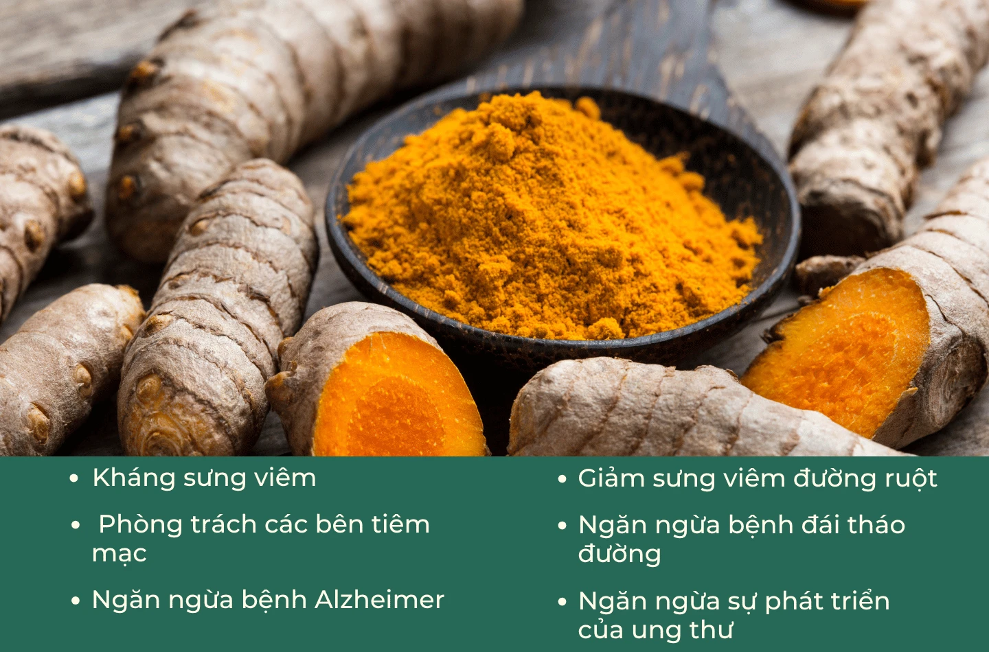 Nghệ chứa tinh dầu (dễ bay hơi) có đặc tính kháng sưng viêm từ hoạt chất curcumin - tạo nên màu vàng tươi đặc trưng của nghệ. Hợp chất này tương tự như các loại thuốc hydrocortisone và phenylbutazone được dùng để giảm viêm thấp khớp, sưng viên đường ruột, ngăn ngừa bệnh đái tháo đường và phòng tránh các bệnh tim mạch, đột quỵ do các mảng bám trên thành động mạch gây nên. Vẫn là hoạt chất curcumin “thần kì” giúp hạn chế hình thành protein amyloid-b trong não - đây là nguyên nhân chính gây tổn thương (oxy hoá). (Bệnh viện đa khoa quốc tế Vinmec, 2024)