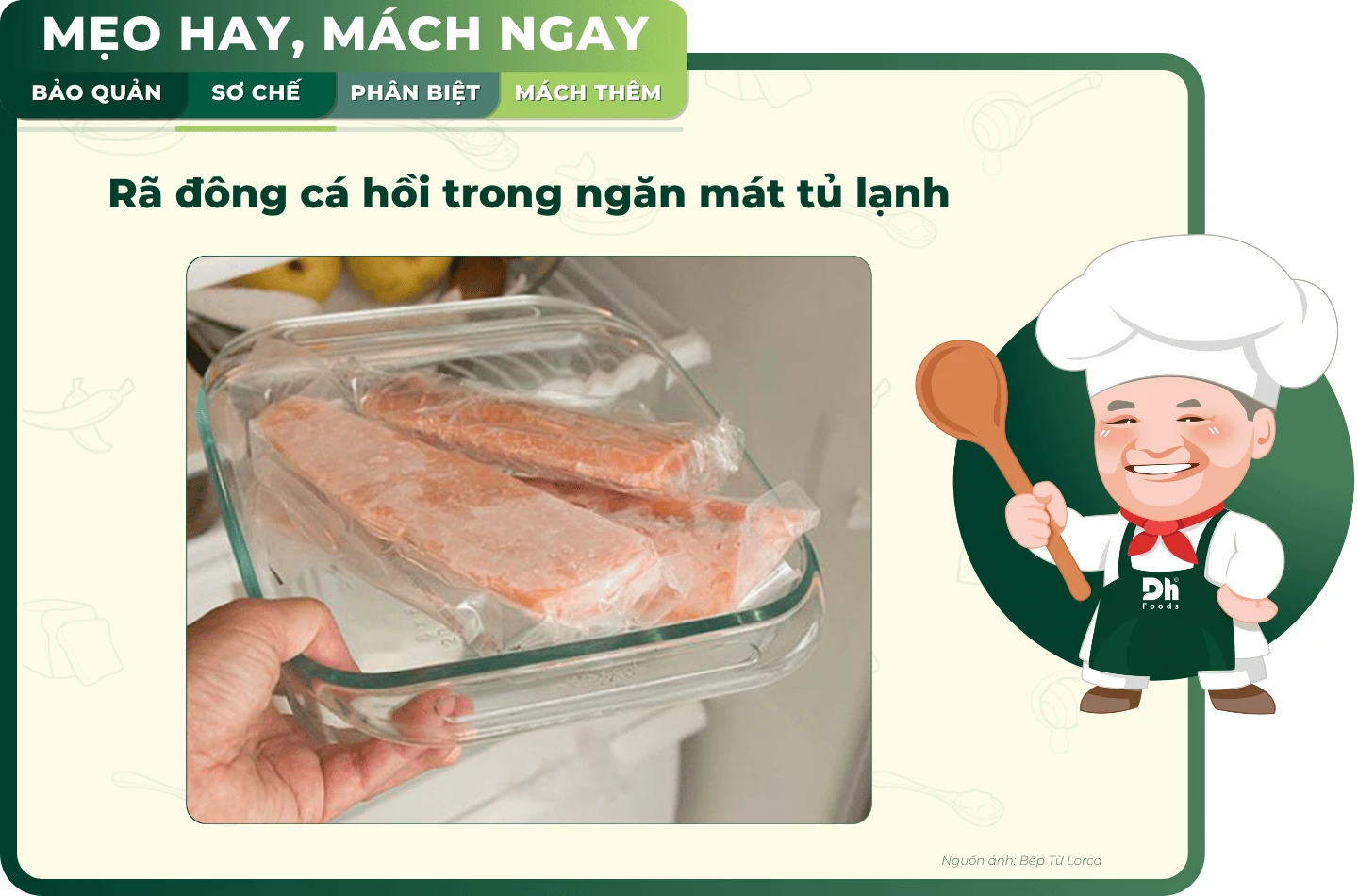 Lưu ý quan trọng: Sau khi rã đông cá hồi đông lạnh bạn nên chế biến ngay, hoặc bảo quản trong ngăn mát và sử dụng trong vòng 24 giờ để đảm bảo an toàn thực phẩm. Đặc biệt, tuyệt đối không tái đông lạnh cá hồi đã rã đông, vì quá trình này sẽ làm cá mất đi độ tươi, kết cấu trở nên bở và có nguy cơ nhiễm khuẩn cao.