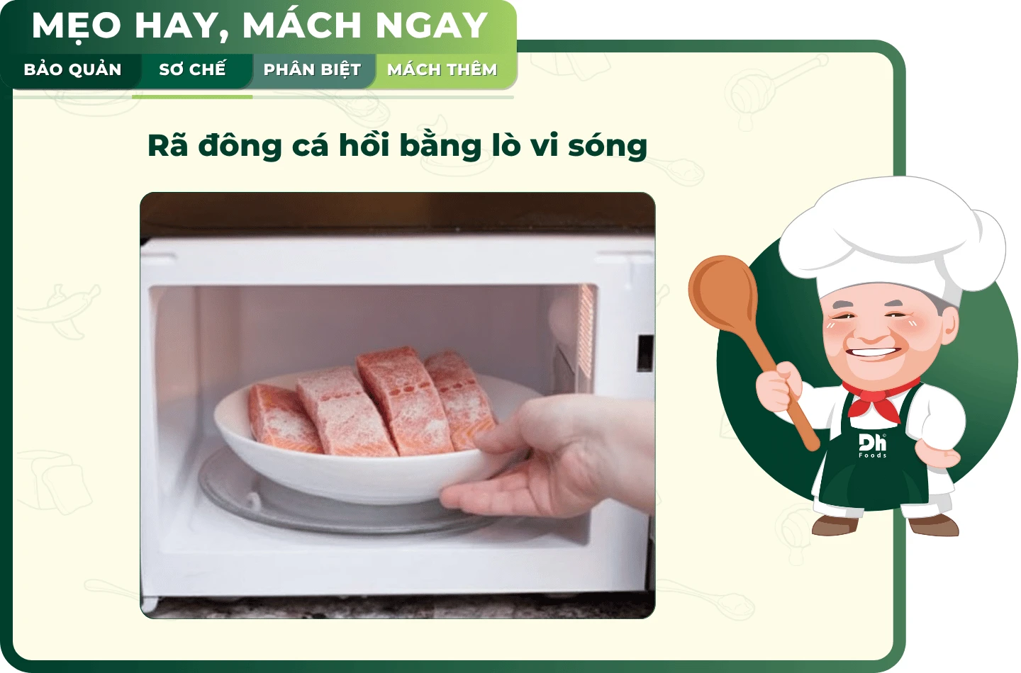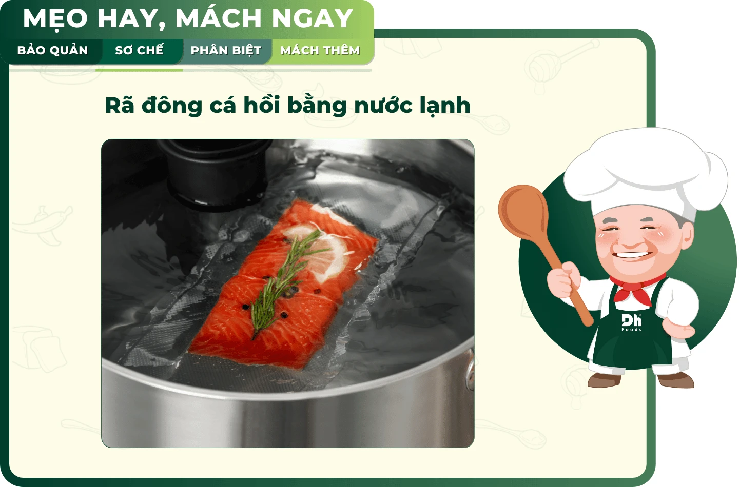Ngoài việc bảo quản đúng cách thì rã đông cá hồi cũng rất quan trọng, đây là bước quyết định trực tiếp đến chất lượng và hương vị miếng cá khi thưởng thức. Dh Foods gợi ý cho bạn 3 cách rã đông cá hồi đông lạnh phổ biến nhất sau đây: