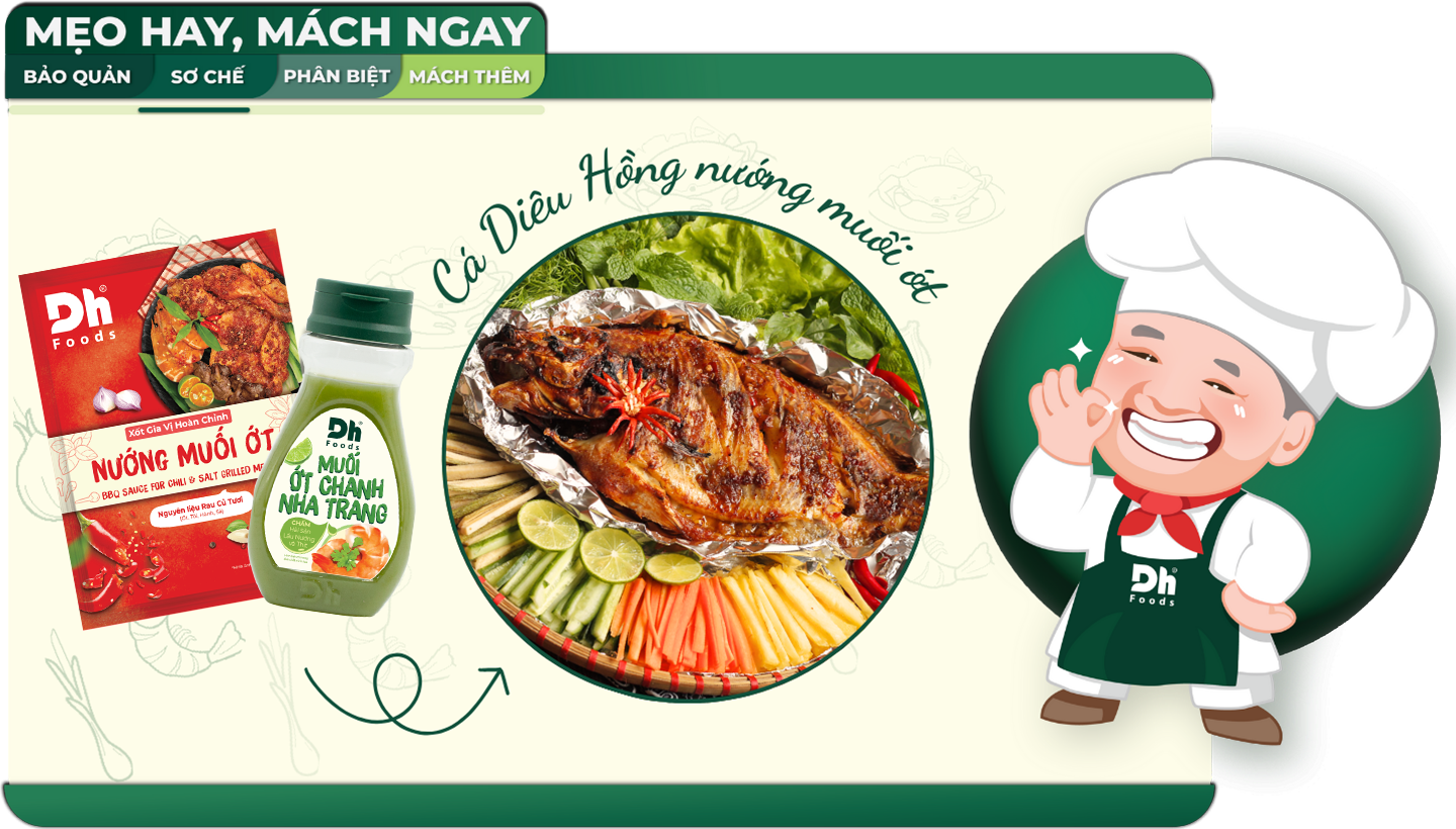 Cá nướng cuốn rau sống là lựa chọn hoàn hảo cho những dịp quây quần bên gia đình và bạn bè. Sử dụng gói Xốt Gia Vị Hoàn Chỉnh Nướng Muối Ớt, bạn chỉ cần chuẩn bị cá đã sơ chế sẵn và rau xanh là đã có ngay một món cá nướng cuốn rau, bắt mắt, vị đậm đà vừa ăn. Gói xốt không chỉ giúp thịt cá thấm gia vị nhanh mà còn đảm bảo mùi thơm hấp dẫn từ hành tím, tỏi Bắc, Sả tươi và Ớt đỏ. Đừng quên chấm thêm Muối Ớt Chanh Nha Trang để nhân đôi vị chua cay ngon miệng nhé!