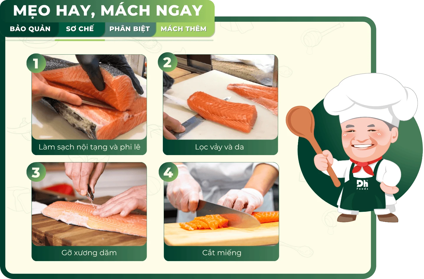 Nếu bạn chọn mua cá hồi nguyên con thay vì phi lê sẵn, khâu sơ chế là bước rất quan trọng để đảm bảo thịt cá tươi và dễ chế biến. Dh Foods gợi ý bạn các bước để sơ chế cá hồi được sạch đúng cách: