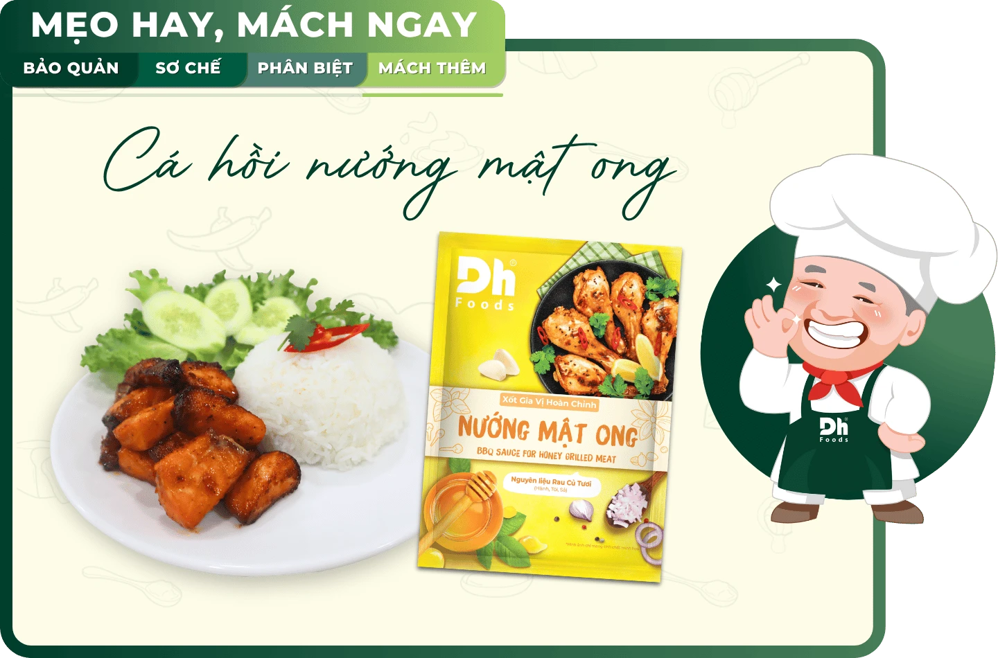 Giờ đây, việc nấu món này càng đơn giản hơn nhờ Xốt Gia Vị Hoàn Chỉnh Nướng Mật Ong Dh Foods. Chỉ cần ướp Cá hồi với gói xốt rồi cho vào nồi chiên không dầu, bạn đã có ngay món nướng chuẩn vị mà không cần nêm nếm gì thêm.