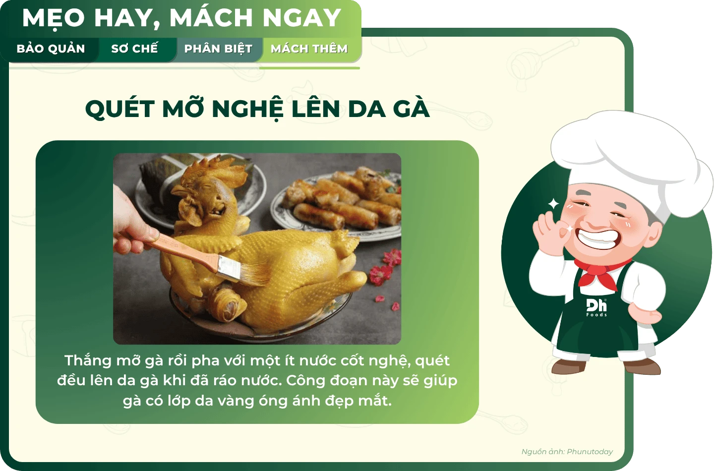 Để da gà có màu vàng bắt mắt, bạn thắng mỡ gà rồi pha với một ít nước cốt nghệ, sau đó quét đều lên mình gà khi đã ráo nước. Cách này sẽ giúp gà có lớp da vàng óng ánh đẹp mắt.