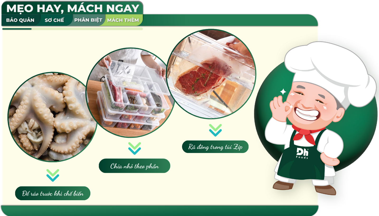 Khi bảo quản ngăn đá, đừng để toàn bộ số bạch tuộc chung túi vì mỗi lần rã đông sẽ làm bạch tuộc mất nước và giảm chất lượng nếu không dùng hết trong một lần. Thay vào đó, bạn hãy chia nhỏ thành từng phần vừa ăn, bảo quản trong hộp kín hoặc túi zip. Nó sẽ giúp bạn tiết kiệm thời gian rã đông và giữ bạch tuộc luôn tươi ngon.