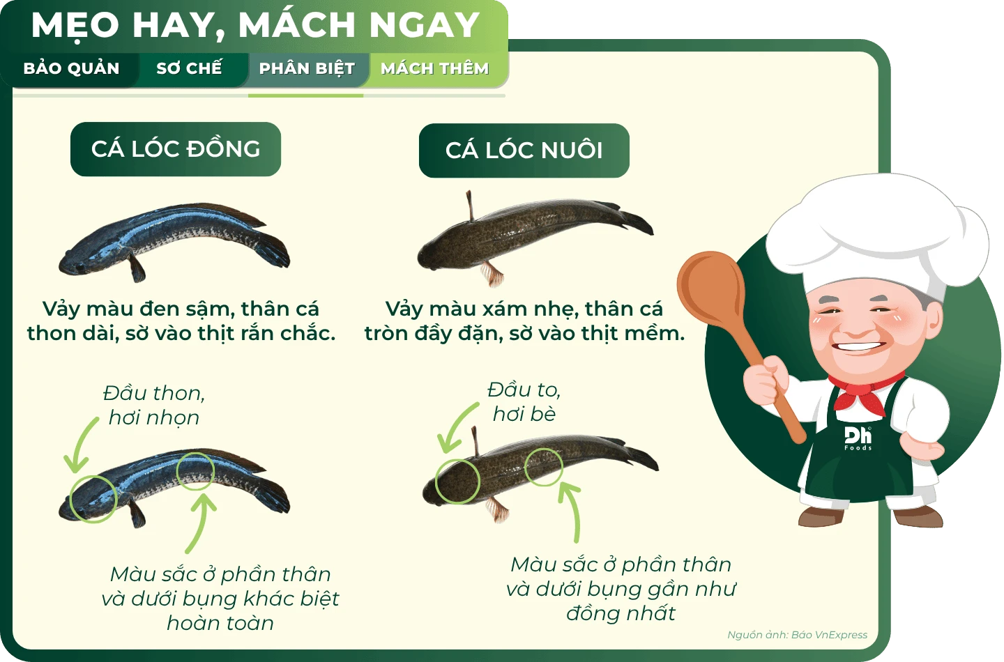 Để có món canh chua hay cá kho đúng điệu, việc chọn được đúng cá lóc đồng chắc thịt, không tanh là bí quyết không phải người nội trợ nào cũng biết. Theo chân Dh Foods tìm hiểu cụ thể cách phân biệt cá lóc đồng - cá lóc nuôi và mẹo sơ chế cá sạch, không còn mùi tanh nhé!