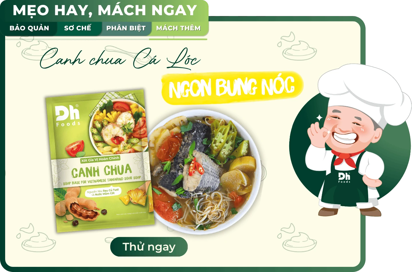 Để tiết kiệm thời gian mà vẫn giữ được hương vị chua thanh đúng chuẩn, Dh Foods gợi ý bạn dùng ngay Xốt Gia Vị Hoàn Chỉnh Canh Chua kết hợp cùng cá lóc tươi ngon. Không cần lỉnh kỉnh nêm nếm, chỉ cần một gói xốt là bạn đã có ngay phần nước canh hài hòa giữa vị chua của me, ngọt của đường và hương thơm đặc trưng của các loại rau thơm Việt. Trổ tài ngay để bữa cơm gia đình thêm ấm cúng nhé!