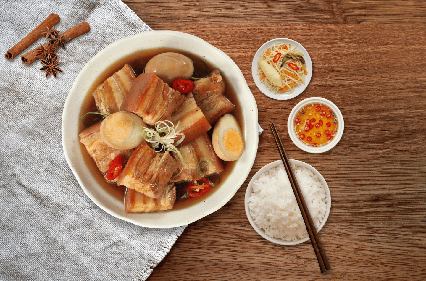 Thịt kho tàu là món ăn bất hủ, gắn liền với ký ức mâm cơm gia đình Việt. Từng miếng thịt ba rọi mềm béo, thấm vị mặn ngọt hài hòa và nước kho vừa miệng khiến ai cũng khó lòng cưỡng lại mà phải xới thêm vài chén cơm. Khi thêm vài quả trứng béo bùi, món ăn càng thêm tròn vị và đủ đầy, vừa ấm áp vừa đưa cơm đến lạ.