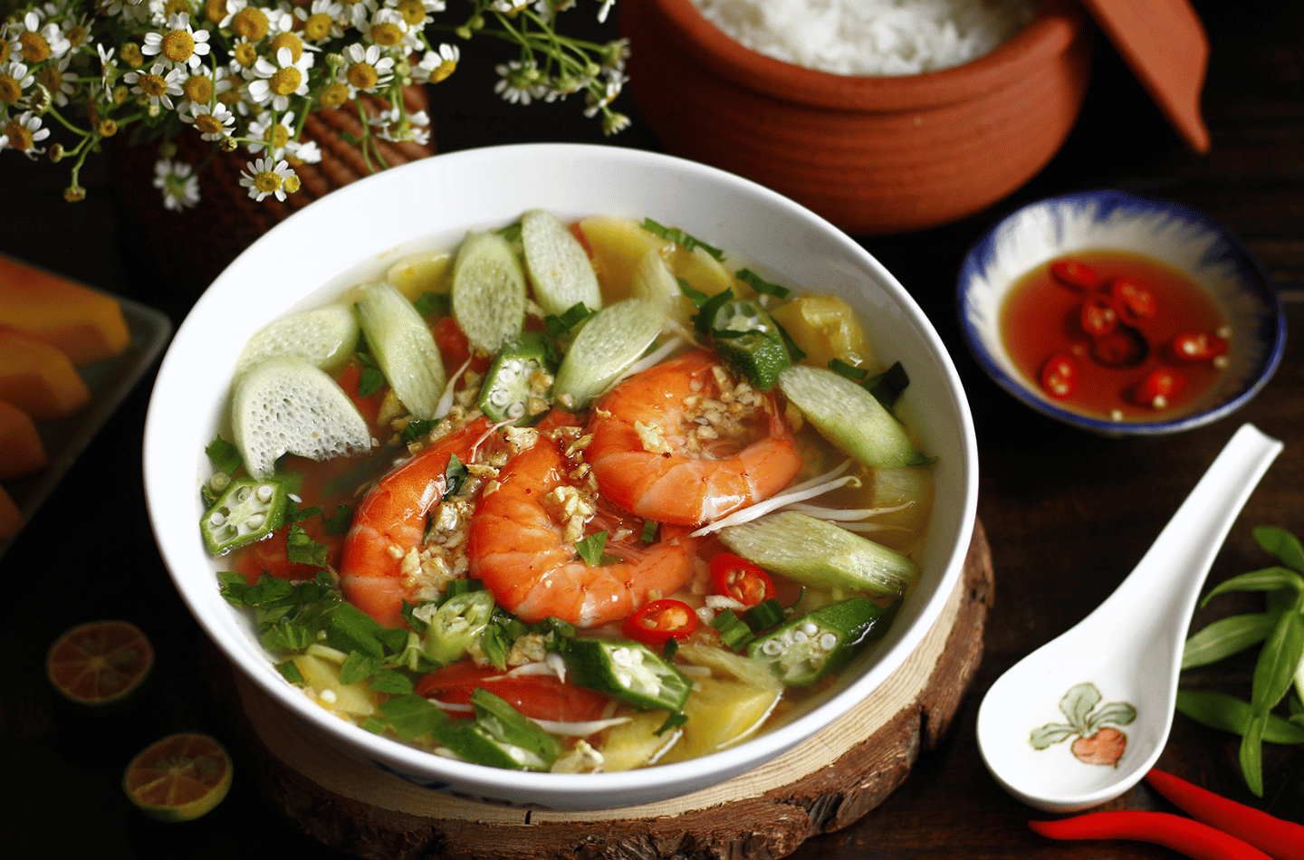 Bữa cơm nhà sẽ thêm trọn vẹn với món canh chua tôm nóng hổi. Nước canh trong điểm thêm sắc đỏ của cà chua, vàng của thơm và đỏ cam của tôm tươi kết hợp là vị chua cay nhẹ nhàng mà vẫn đậm đà cuốn hút. Món ăn không chỉ ngon miệng mà còn giúp bữa cơm thêm phần ấm cúng và hấp dẫn.