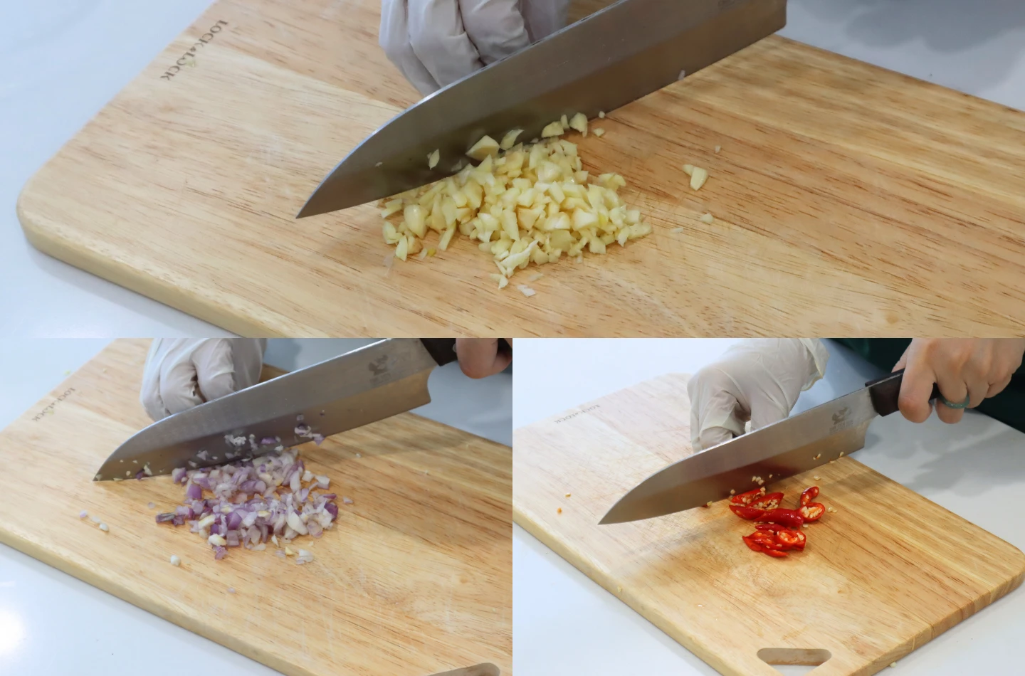 Giá gỗ ngâm nước và nhặt bỏ các xác đỗ,cắt nhỏ rau om và ngò gai, tỏi và hành tím.
