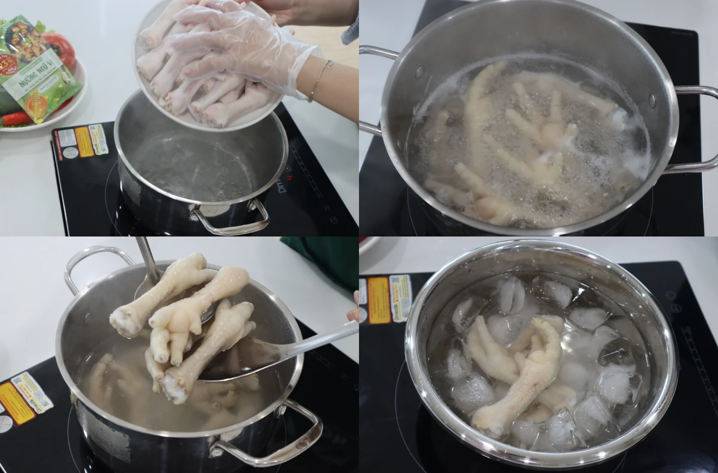 Tiếp đến, luộc sơ chân gà khoảng 3 - 5 phút rồi vớt ra cho vào nước đá ngay tầm 2 phút cho gà được giòn.