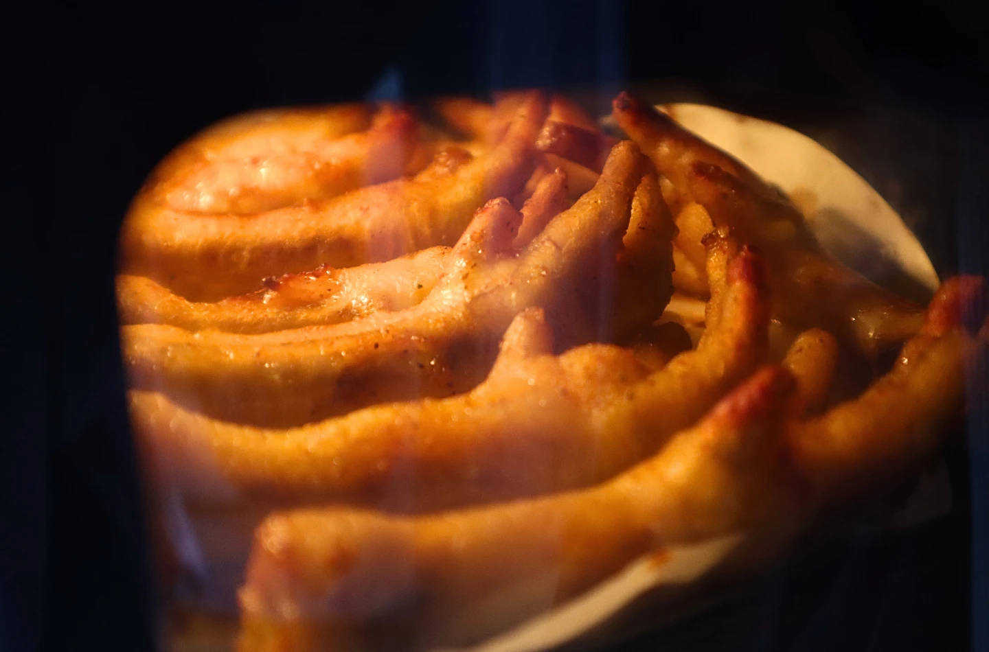 Xếp chân gà vào nồi chiên không dầu, nướng ở nhiệt độ 180 độ C trong vòng 15 - 25 phút.