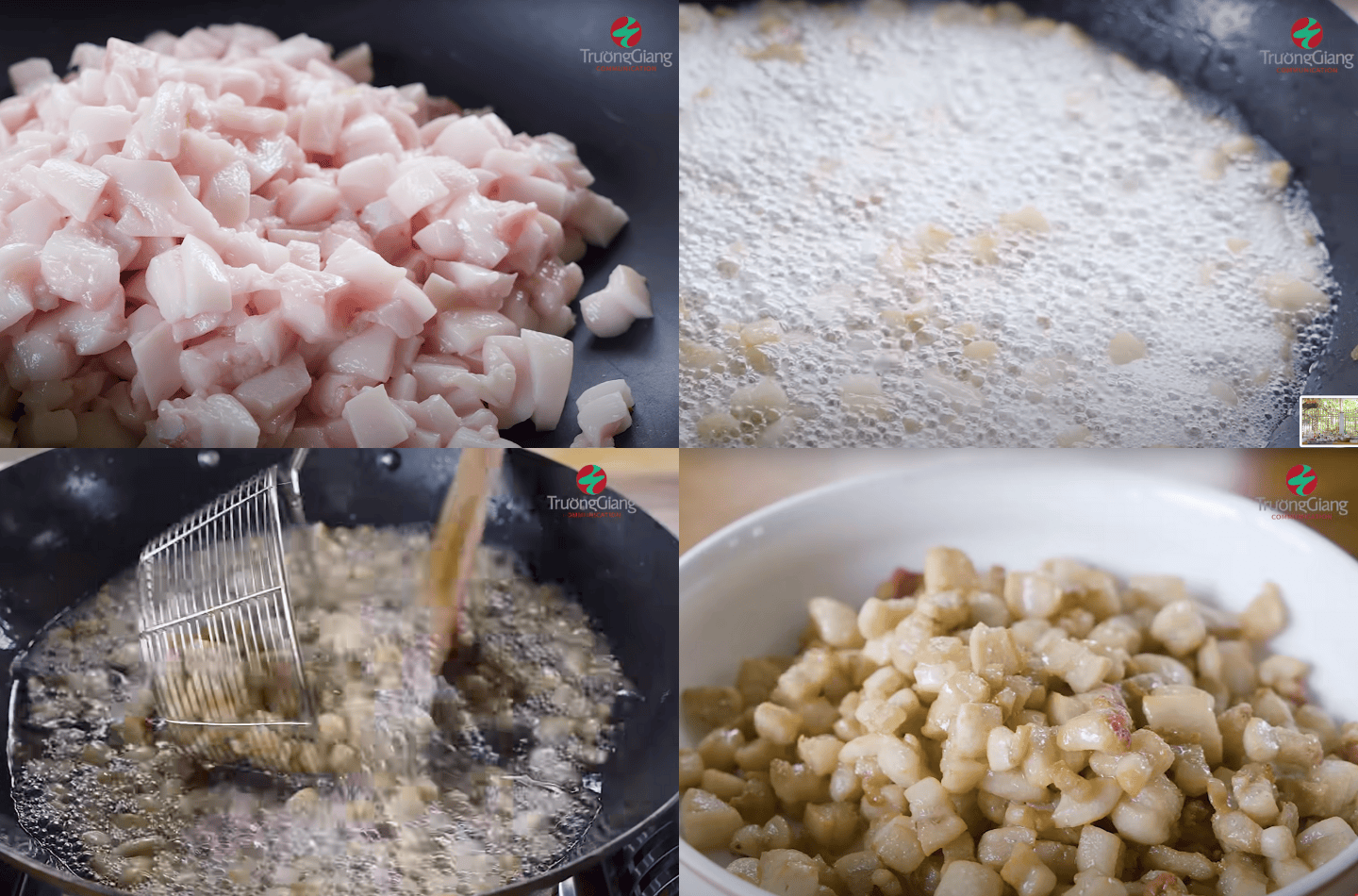 Trong lúc đợi sườn thấm gia vị, bạn có thể bắt tay vào thắng mỡ. Mỡ heo được cắt nhỏ rồi cho vào chảo nóng để lấy phần nước mỡ. Lưu ý đảo đều tay trên lửa nhỏ để mỡ từ từ tiết ra dầu và không bị cháy mà vẫn giữ được độ trong của nước mỡ. Đun đến khi tóp mỡ khô lại, chuyển sang màu vàng thì tắt bếp và vớt ra ngoài.