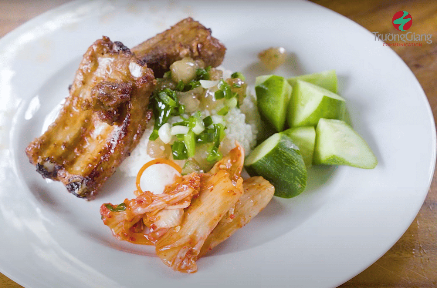 Xới cơm tấm ra đĩa, bày thêm dưa leo, kim chi và ngó sen chua ngọt hoặc đồ chua ưa thích. Đặt sườn nướng lên cơm, rưới chút mỡ hành cùng tóp mỡ và nước mắm pha sẵn. Thưởng thức ngay món cơm tấm sườn khi còn nóng để cảm nhận trọn vẹn hương vị chuẩn Sài Gòn.