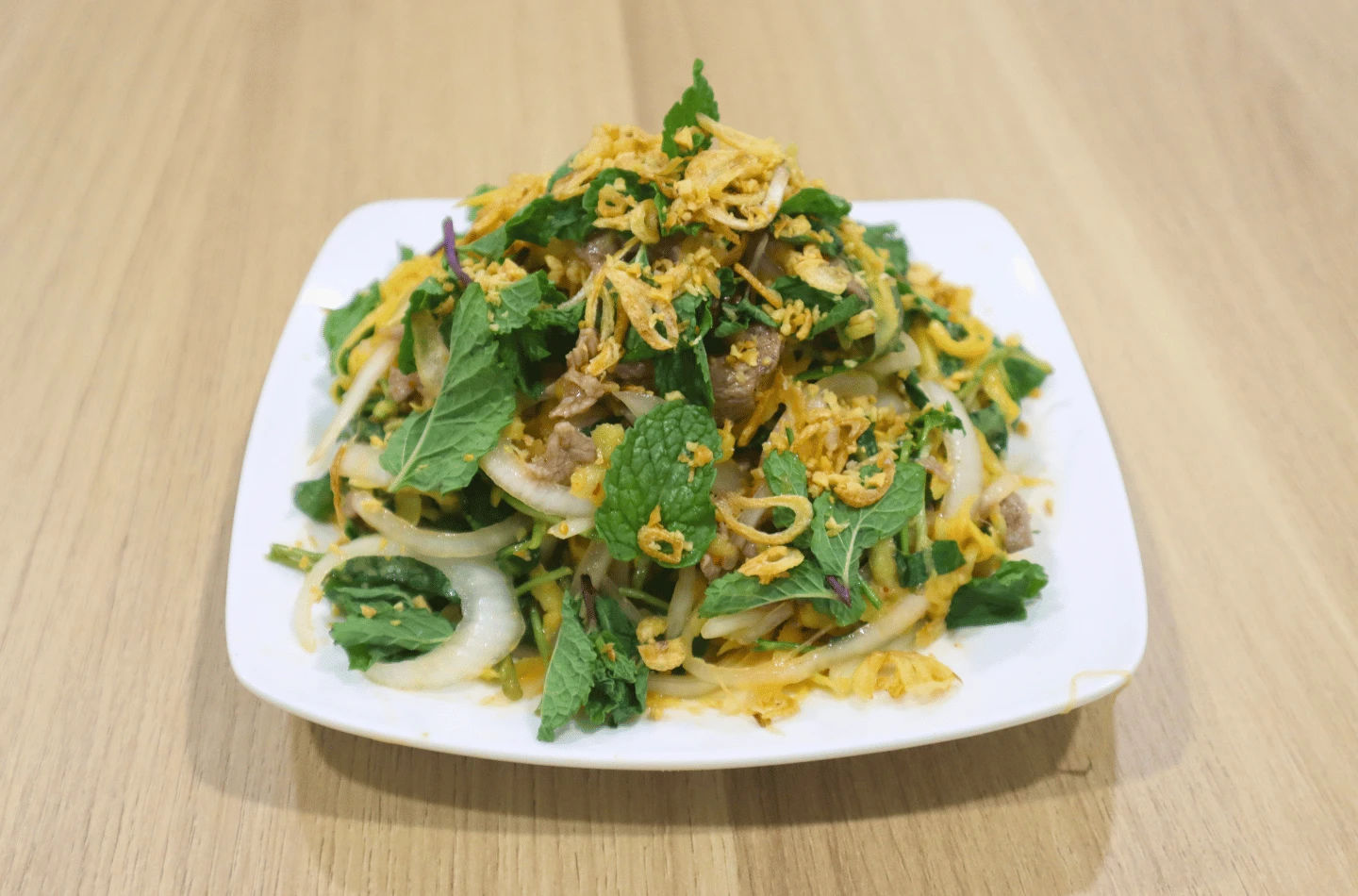 Gỏi bò sốt Thái khi hoàn thành nổi bật với sắc màu tươi tắn, hòa quyện giữa xoài xanh giòn mát, rau thơm xanh mướt và những lát bò mềm ngọt. Hương sả tắc dậy lên đầy cuốn hút, lan tỏa ngay từ khi bày ra đĩa. Khi thưởng thức, vị chua thanh, cay nhẹ và chút mặn ngọt đan xen tinh tế, ôm trọn từng nguyên liệu, tạo nên cảm giác tươi mới, đậm đà và cực kỳ bắt vị.
