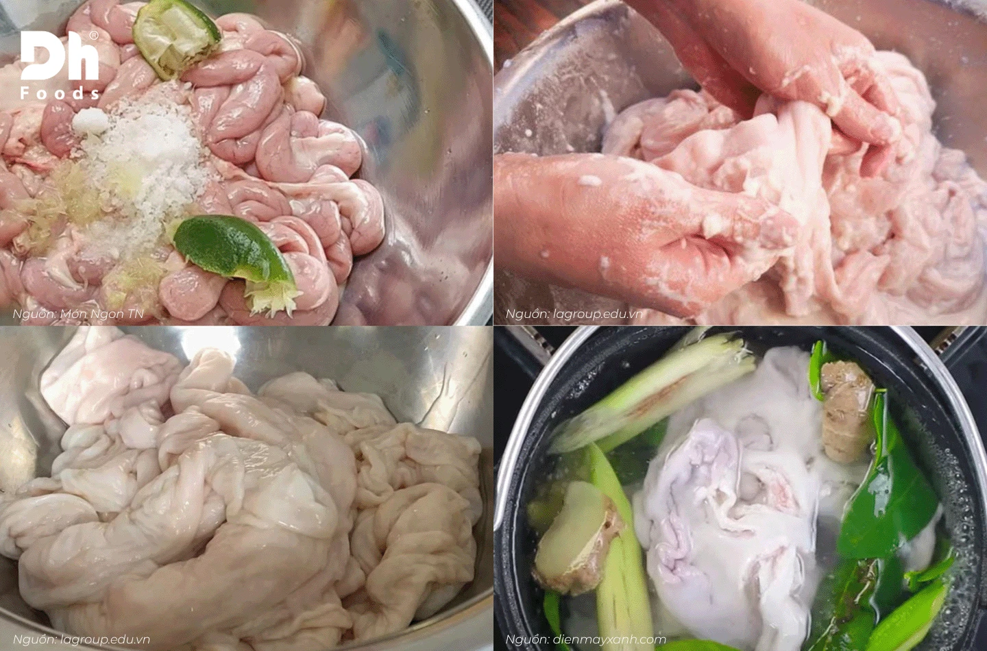 Cho 500g lòng heo vào thau bỏ vào 100g muối, và 2 quả chanh đã cắt đôi, rồi dùng tay xoa bóp trong 15 phút để các chất bẩn, đắng trong lòng heo được ra bớt. Sau đó, bạn rửa sạch qua 2 - 3 lần nước. Lộn ngược lòng heo, rồi tiếp tục thao tác như trên.