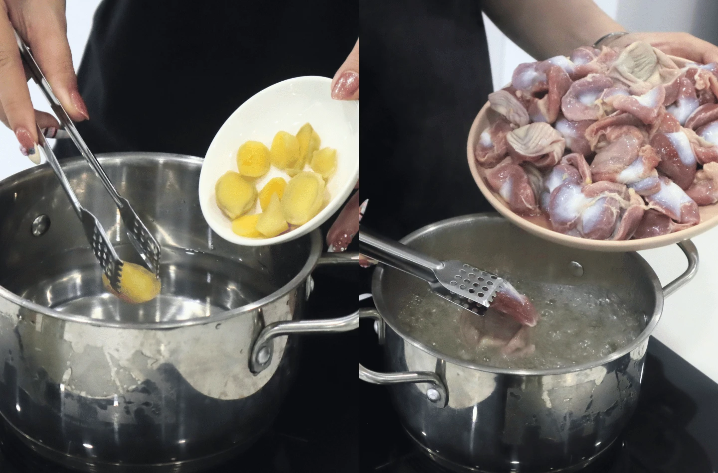 Đun sôi một nồi nước với vài lát gừng, cho mề vào trụng nhanh rồi vớt ra ngay. Cách này giúp mề sạch sâu, thơm nhẹ và giữ được độ giòn đặc trưng.