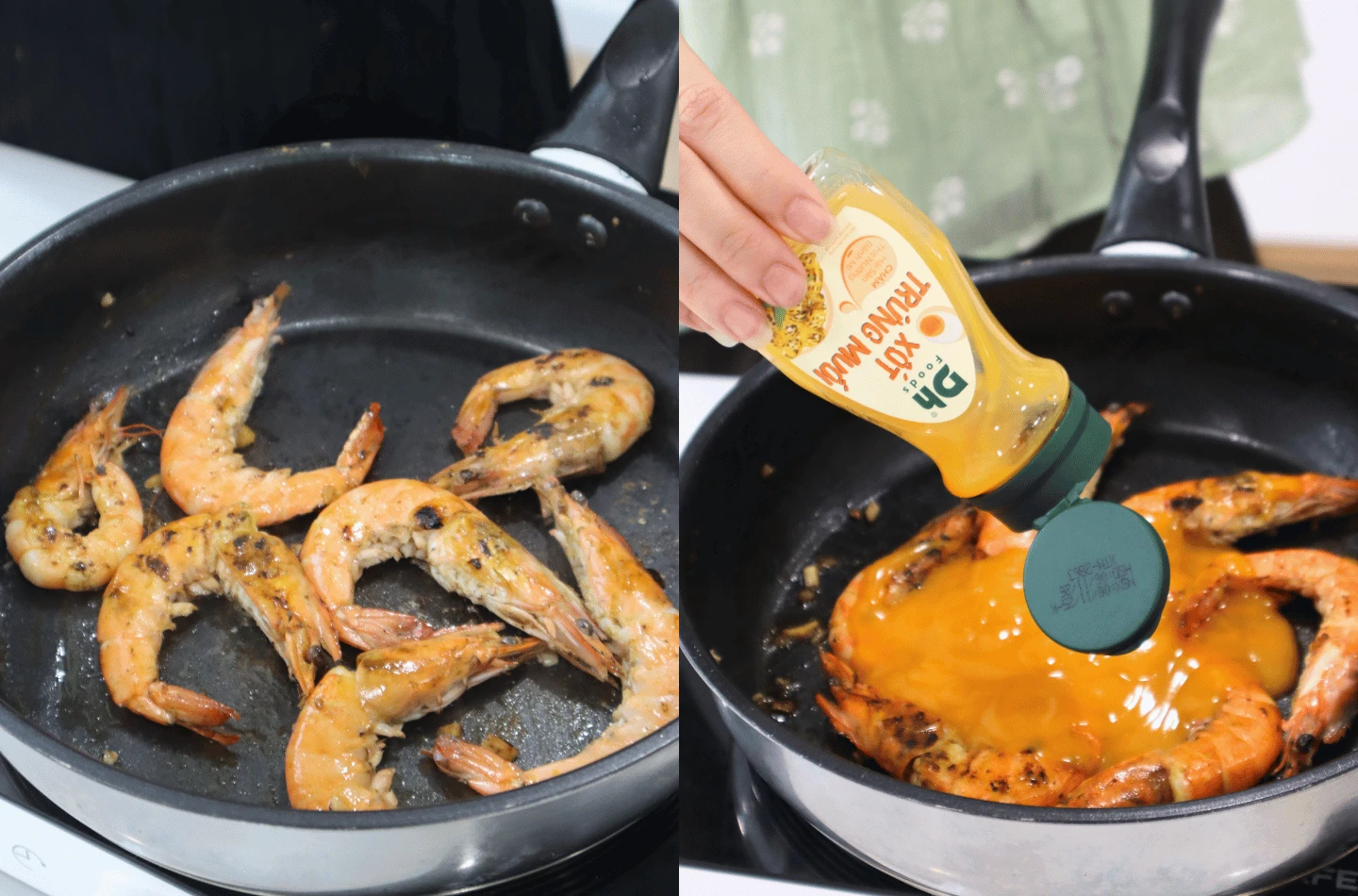 Cho tỏi vào phi vàng đều, sau đó cho tôm vào đảo trên lửa nhỏ. Khi tôm vừa chín tới, cho Xốt Trứng Muối vào tuỳ thích rồi bật lửa nhỏ để sốt sánh lại áo đều trên tôm.