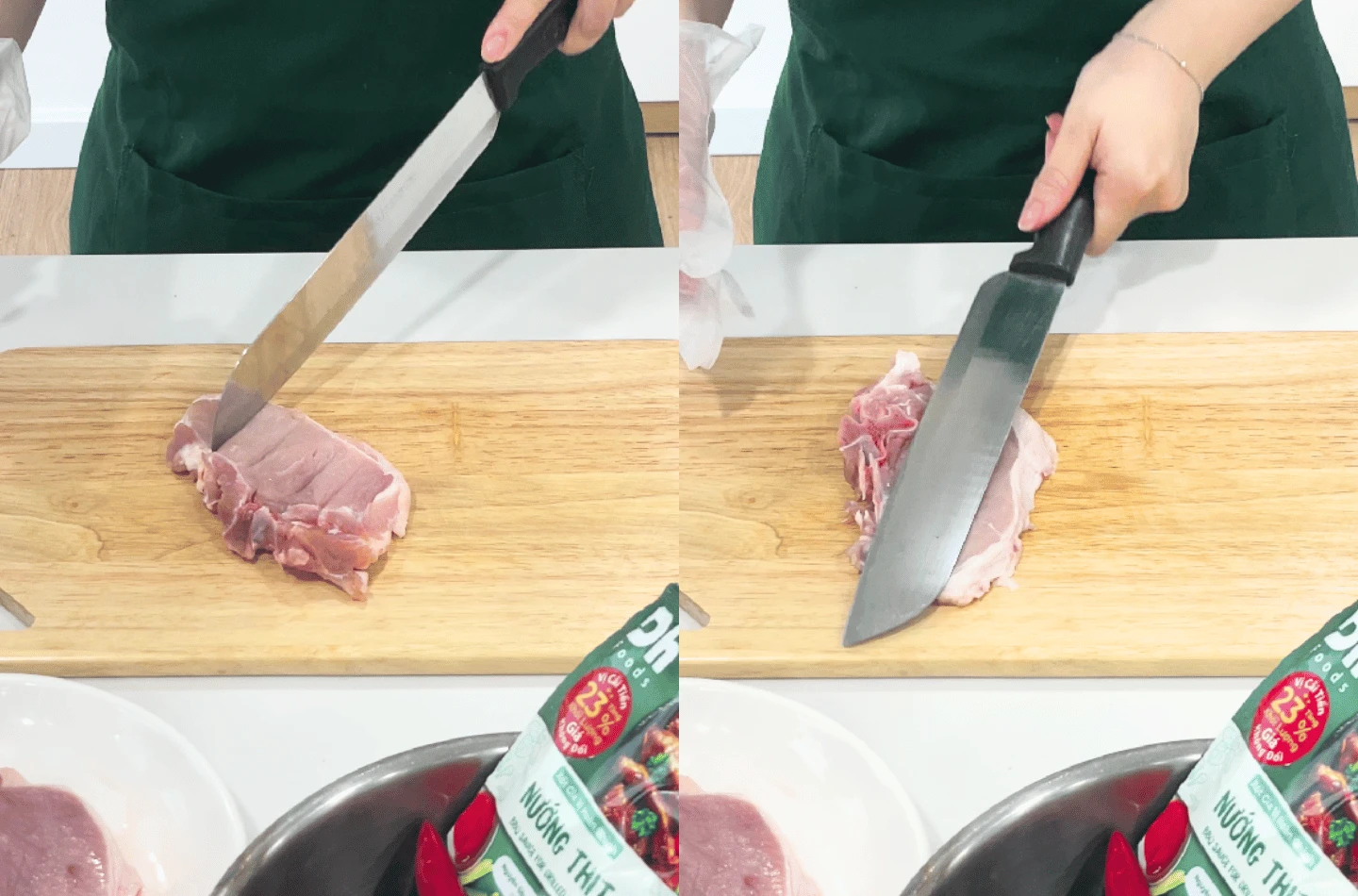 Thịt cốt lết sau khi mua về rửa sơ qua nước lạnh rồi thấm khô bằng khăn sạch. Dùng dao cắt bỏ bớt phần mỡ dày hoặc gân lớn, giữ lại một ít mỡ mỏng để thịt không bị khô. Bạn nhớ dần thịt bằng lưng dao hoặc dụng cụ dần thịt để thịt trở nên mềm hơn nhé!