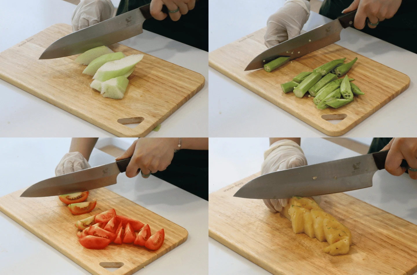 Dọc mùng lột bỏ lớp vỏ bên ngoài, cắt xéo thành miếng vừa ăn, rửa lại với nước rồi để ráo. Thơm gọt bỏ mắt và cắt lát vừa ăn, cà chua bổ múi cau, đậu bắp cắt bỏ đầu rồi thái lát.