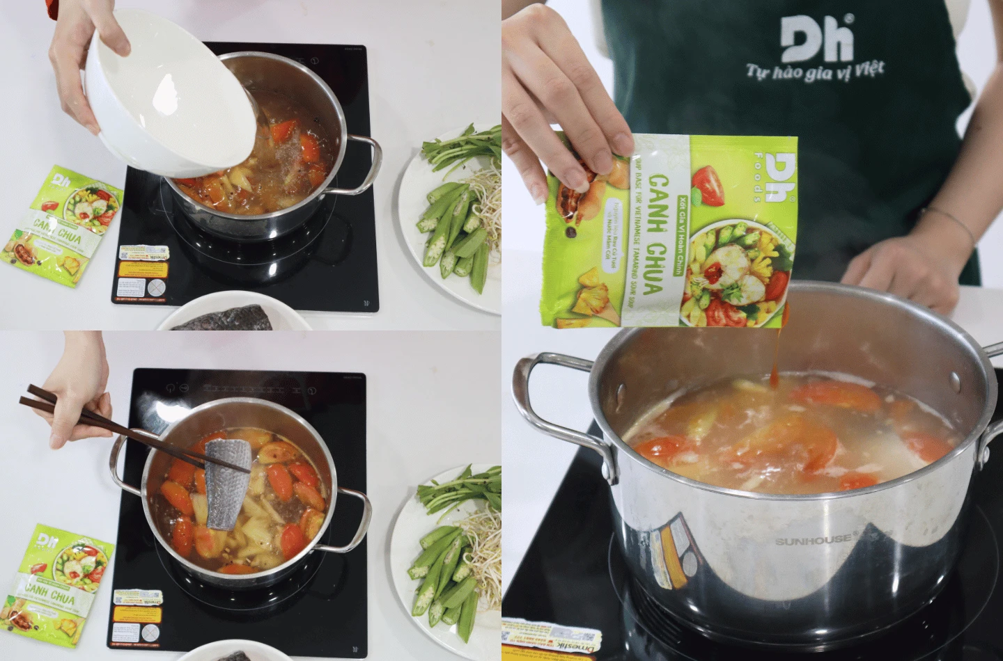 Tiếp theo, đổ khoảng 750ml nước vào nồi và đun sôi. Nước sôi cho cá lóc vào nấu lửa vừa khoảng 5 phút cho cá chín tới, sau đó cho 1 gói Xốt Gia Vị Hoàn Chỉnh Canh Chua Dh Foods vào khuấy đều, không cần nêm nếm thêm.