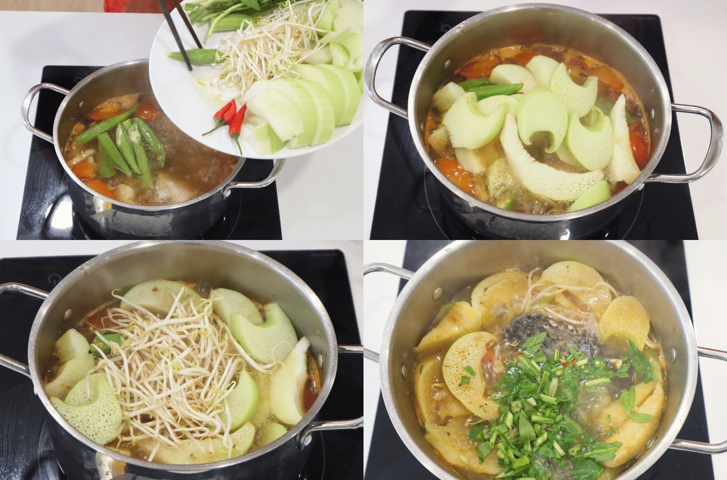Khi nước canh sôi trở lại, lần lượt cho đậu bắp, dọc mùng và giá đỗ vào nấu cùng đến khi rau vừa chín. Cuối cùng, thêm rau om, ngò gai và ớt vào rồi tắt bếp.