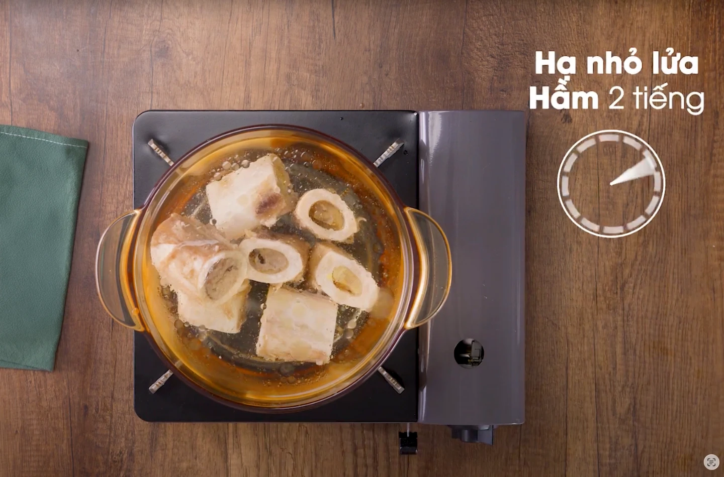 Trong quá trình hầm, bạn thường xuyên vớt bọt trên bề mặt nước để nước dùng được trong. Sau đó, tắt bếp để nguội 1 tiếng.