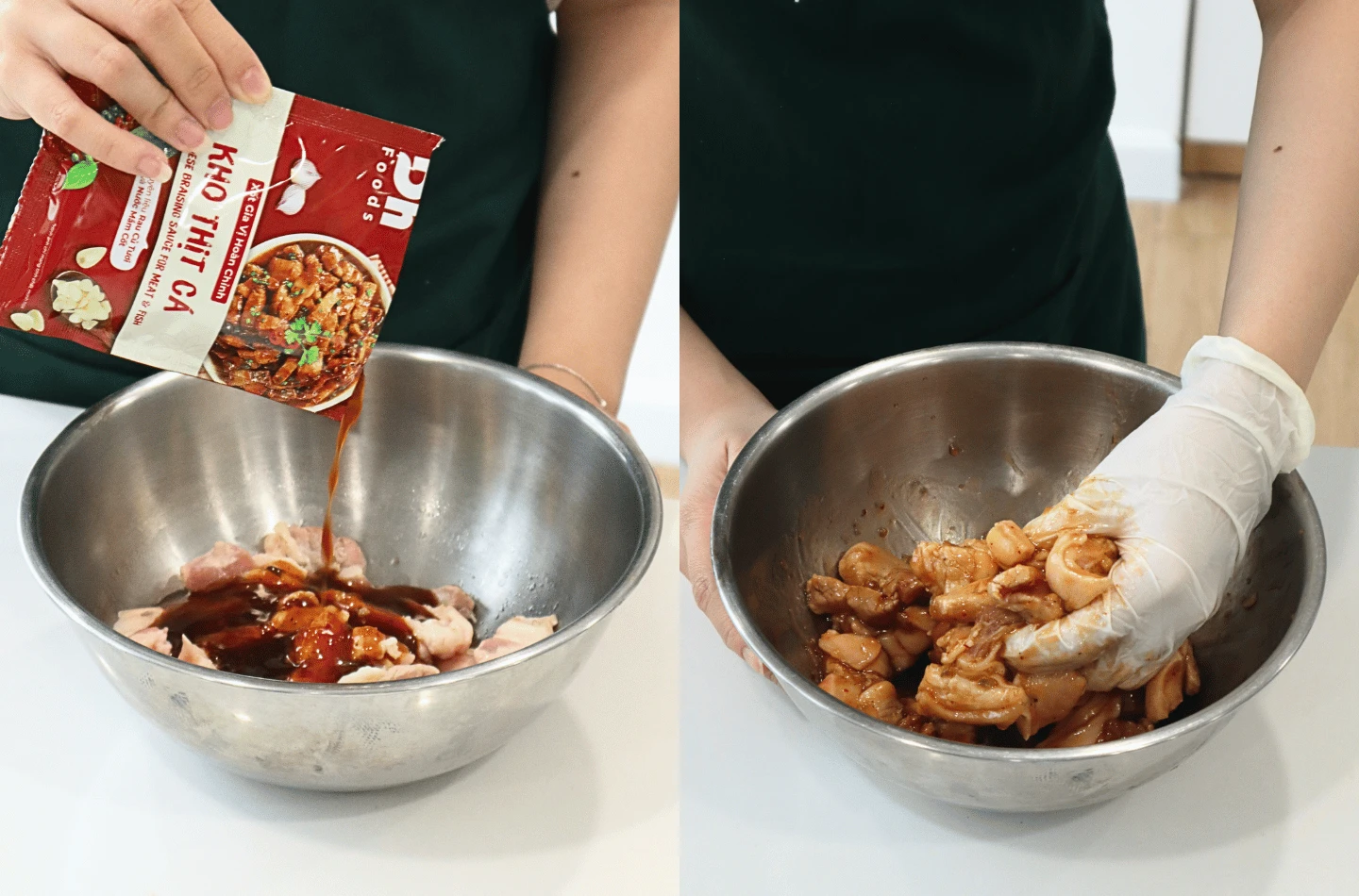 Cho thịt ba chỉ vào tô, thêm 1 gói Xốt Gia Vị Hoàn Chỉnh Kho Thịt Cá rồi trộn đều để xốt thấm vào từng miếng thịt, chú ý để phần mỡ cũng được áo xốt. Ướp khoảng 30-60 phút cho thịt thấm vị, khi kho sẽ mềm ngon và đậm đà hơn.