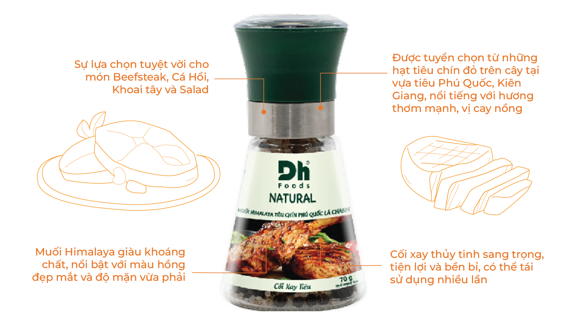 Muối Himalaya giàu khoáng chất, độ mặn vừa phải kết hợp cùng Tiêu Chín Phú Quốc tuyển chọn và Cối Xay thủy tinh sang trọng, bền bỉ. Sự lựa chọn tuyệt vời cho món Beefsteak, Cá Hồi áp chảo và Salad.