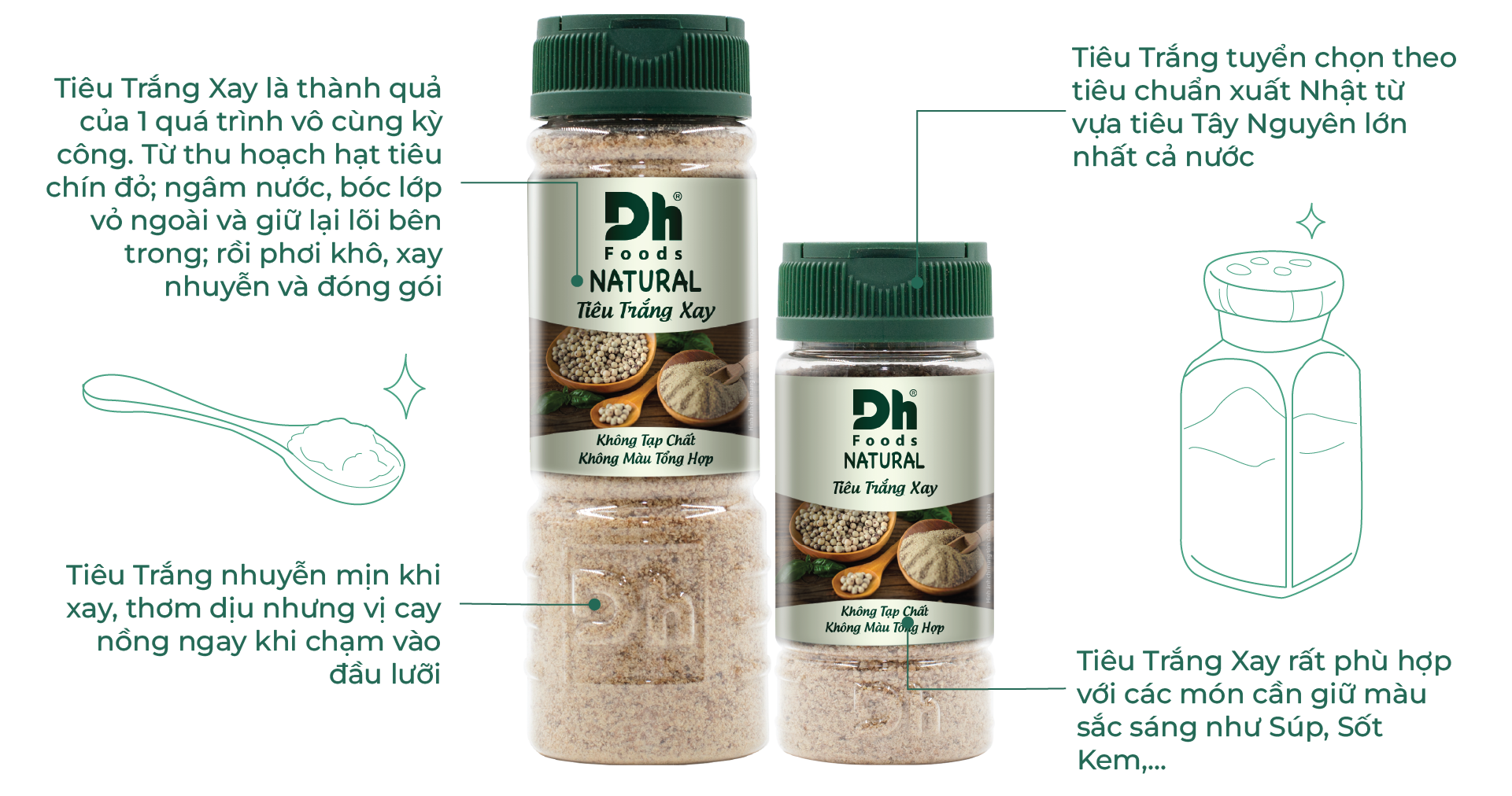 Tiêu Trắng Xay thơm dịu nhưng cay tê ngay khi chạm vào đầu lưỡi. Vừa hay Tiêu Trắng lại không sậm màu như Tiêu Đen, rất hợp với mấy món như Súp Nấm Tuyết hay Mỳ Ý Sốt Kem.