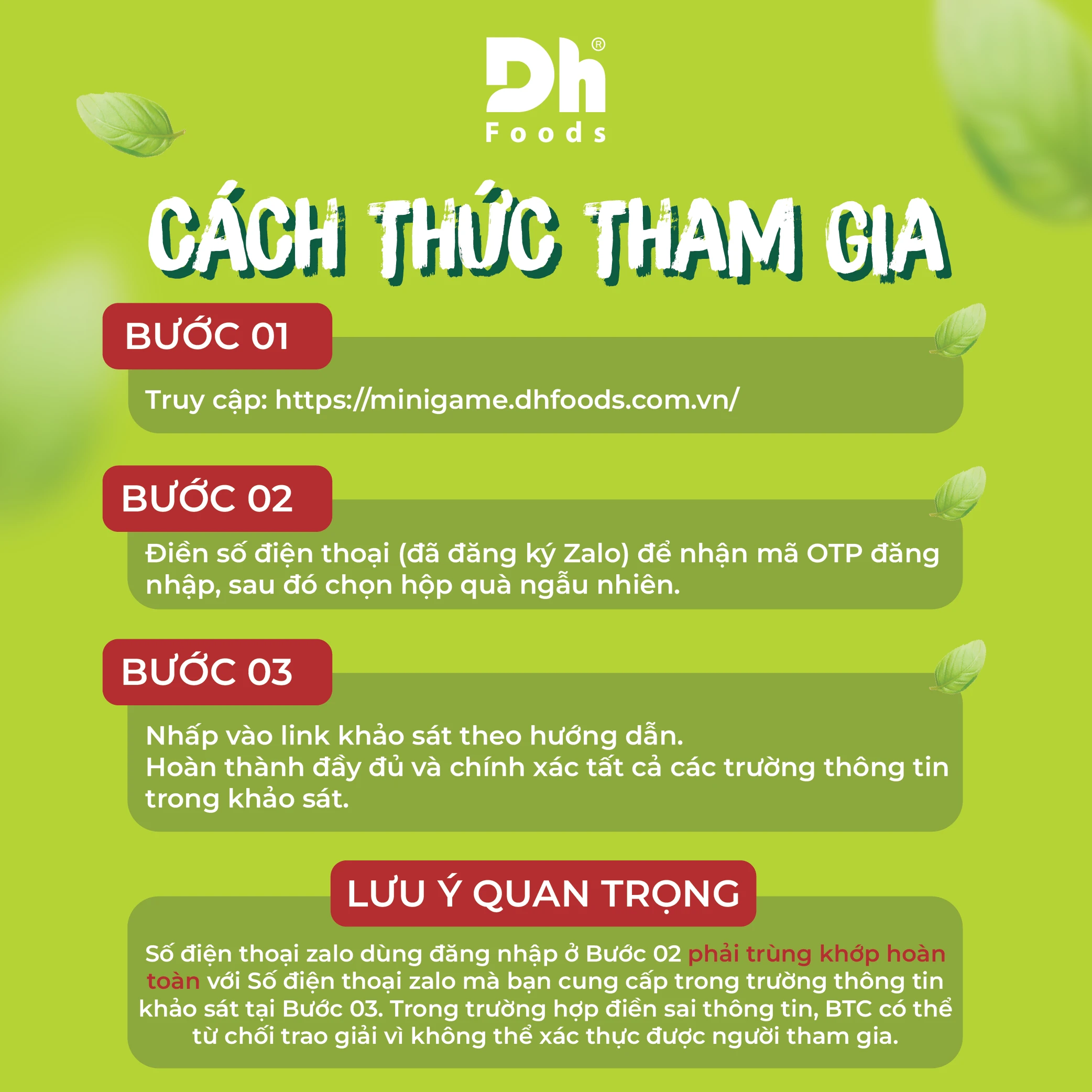 Người tham gia đồng ý để những thông tin cá nhân như Họ Tên, một phần số điện thoại được công khai trong trường hợp Người tham gia thắng giải và giải thưởng được công bố trên Fanpage Dh Foods.