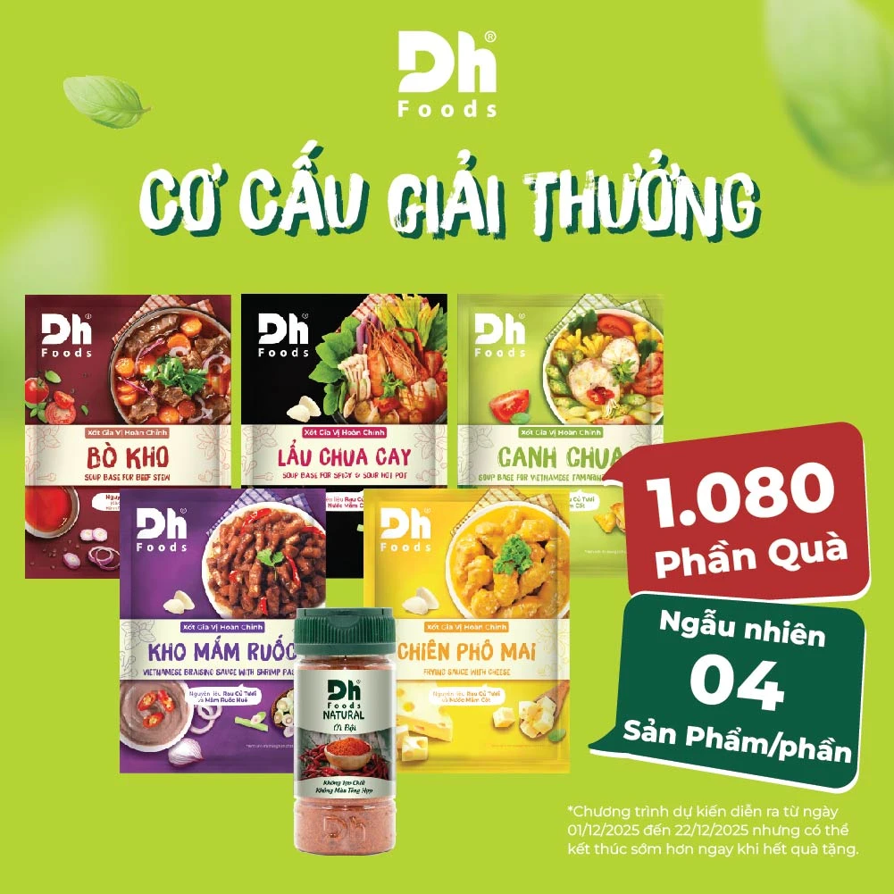 Thời gian diễn ra: Từ 20h00 ngày 01/12/2025 đến 23h59 ngày 22/12/2025. (Lưu ý: Chương trình có thể kết thúc sớm hơn ngay khi hết quà tặng. Mọi cập nhật sẽ được thông báo trên Fanpage Dh Foods.)