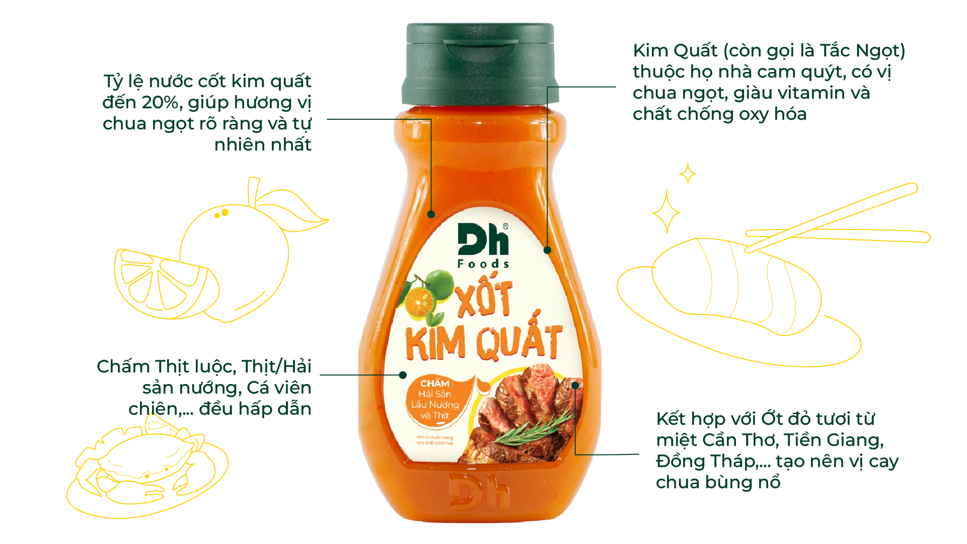 Kim Quất "nhỏ nhưng có võ", làm sốt chua cay thơm ngon lại còn tốt cho sức khỏe. Xốt Kim Quất đặc biệt “hợp cạ” với đủ thứ món, làm dậy vị mấy xâu thịt nướng, giải ngấy cho cá viên chiên hay trộn salad cũng siêu cuốn.