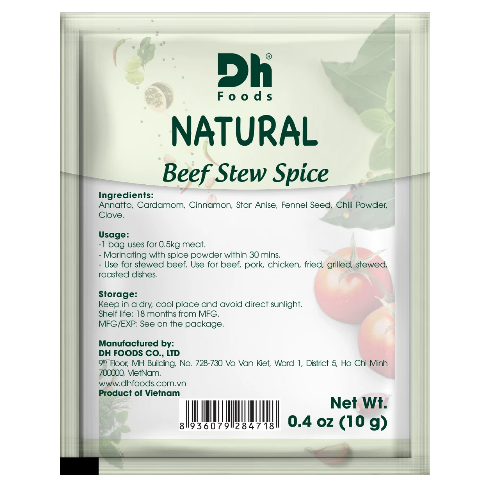 ナチュラルビーフシチュースパイスは、カルダモン、シナモン、フェンネル、スターアニスなど、厳選されたハーブとスパイスを使用しています。これらの素材が調和し、香り豊かでコクのある赤橙色のスープが完成します。パン、ご飯、麺と一緒に楽しめる、本格的なビーフシチューにぴったりです。