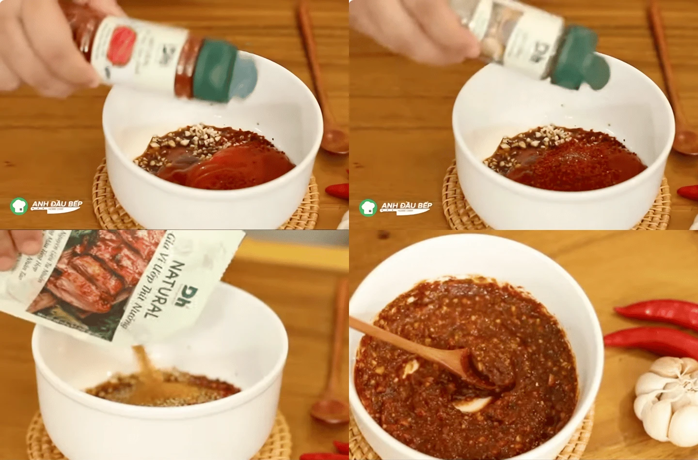 Bằm nhuyễn tỏi. Sau đó trộn chung với hỗn hợp dưới đây rồi trọn đều: