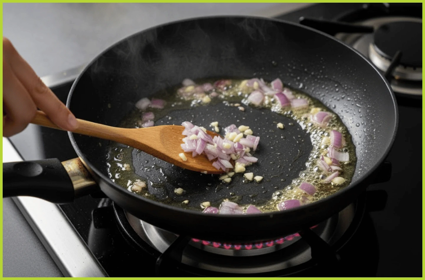 Sau đó, làm nóng chảo trên bếp rồi cho lần lượt 1.5 muỗng canh dầu ô liu, hành tím và tỏi vào đảo đều trong 1 phút.