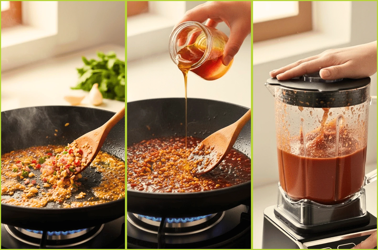 Bước cuối cùng là đổ toàn bộ hỗn hợp xốt vừa nấu vào máy xay sinh tố. Xay cho đến khi xốt nướng mật ong trở nên thật mịn.