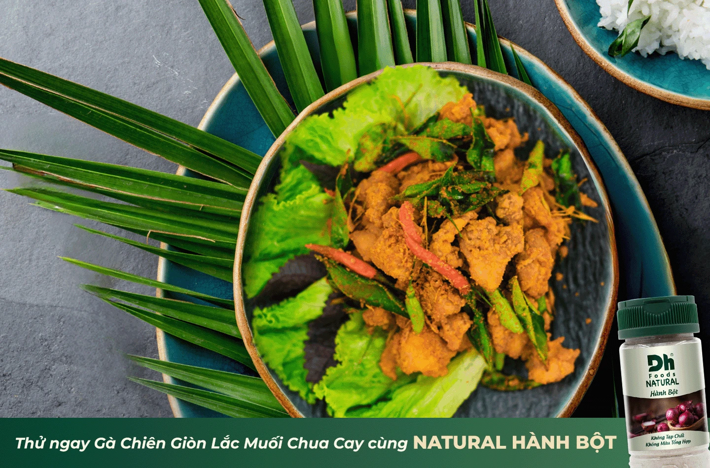 Đối với món Gà Chiên Giòn siêu "gây nghiện", Hành Bột được sử dụng ở cả hai công đoạn quan trọng. Đầu tiên, dùng Natural Hành Bột để tẩm ướp gà trước khi chiên giúp thịt gà thơm và đậm đà hơn. Sau khi gà đã chiên vàng giòn, Hành Bột lại được kết hợp với muối chua cay và các loại thảo mộc khác để tạo nên lớp áo gia vị phủ ngoài hoàn hảo.