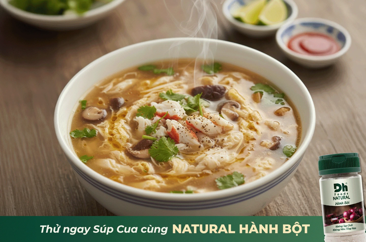 Để nồi Súp Cua thơm ngon và sánh mịn đúng điệu, Hành Bột là một gia vị không thể thiếu. Natural Hành Bột giúp khử mùi tanh của hải sản một cách tinh tế và làm cho nước dùng thêm ngọt sâu, thanh vị. Một ít Hành Bột sẽ không chỉ giúp hương vị nồi súp trở nên hài hòa mà còn tôn lên vị ngọt tự nhiên của thịt cua và các nguyên liệu khác, cho ra đời một món Súp Cua bổ dưỡng và hấp dẫn.