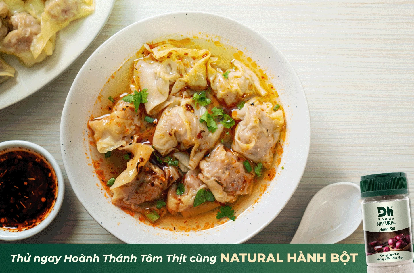 Hành Bột chính là gia vị lý tưởng để tẩm ướp cho phần nhân tôm thịt của Hoành Thánh. Khi hòa quyện vào hỗn hợp nhân tôm thịt, Natural Hành Bột không chỉ thấm sâu tạo vị đậm đà, dậy mùi thơm mà còn giúp nhân luôn khô ráo, giữ trọn độ dai ngon sau khi luộc hoặc chiên. Nhờ đó, món Hoành Thánh Tôm Thịt thêm hài hòa về hương vị và cuốn hút ngay từ những miếng cắn đầu tiên.