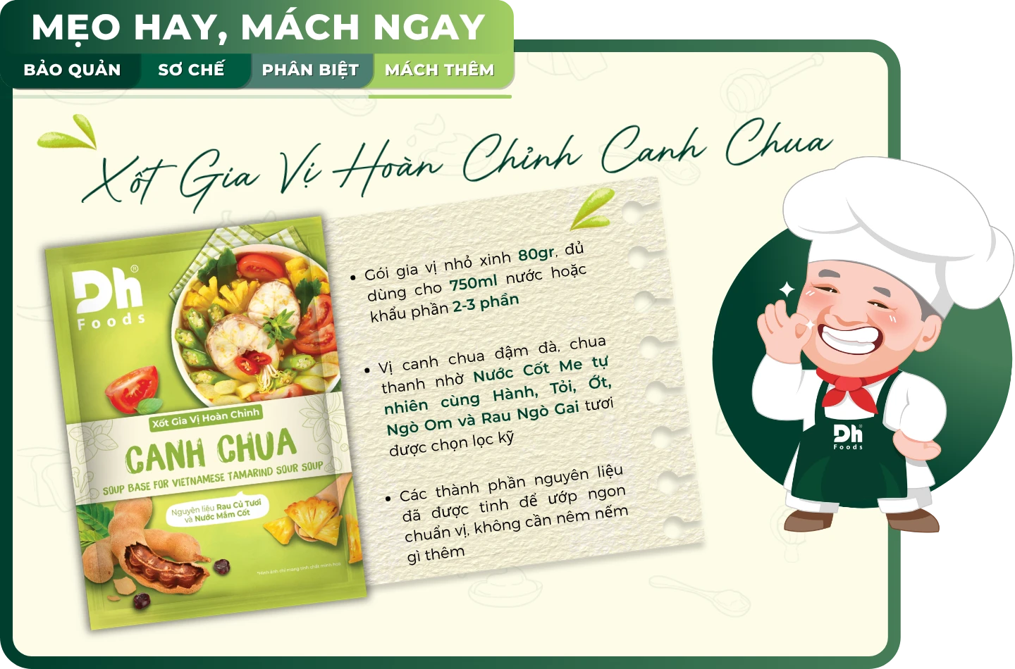 Để biến những nguyên liệu tươi ngon trên thành món canh xuất sắc mà không tốn nhiều công sức, Xốt Gia Vị Hoàn Chỉnh Canh Chua của Dh Foods chính là “vũ khí bí mật” dành cho bạn.
